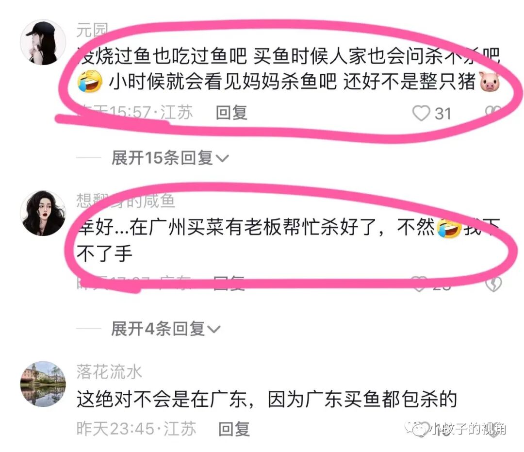 也有网友说:没烧过鱼也吃过鱼吧?买鱼的时候人家不问你杀不杀吗?再说了,小时候就没看见过妈妈杀鱼?还好不是整只猪!