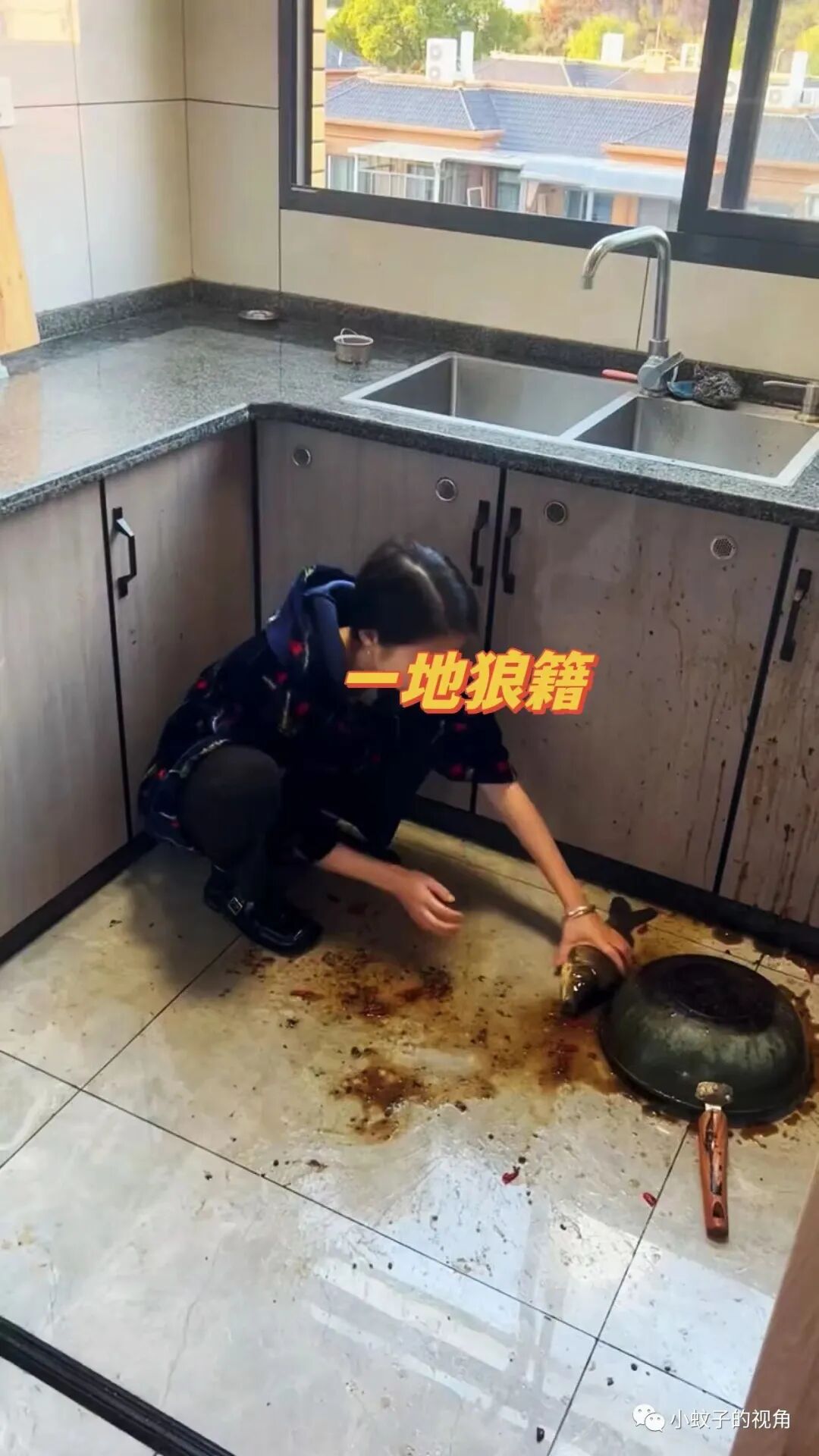 带着一身料汁跳到锅里,再跳到地上,把锅都扣在了地上,弄得一地狼藉。