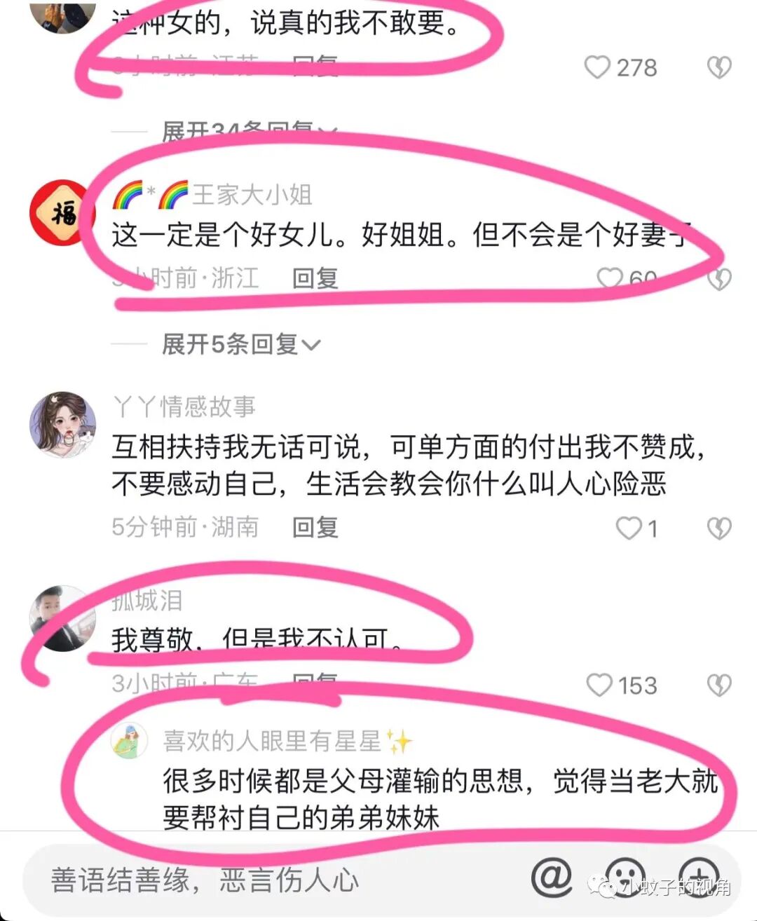 也有网友表示:很多时候这都是父母灌输的思想,觉得当老大就要帮衬自己的弟弟妹妹。