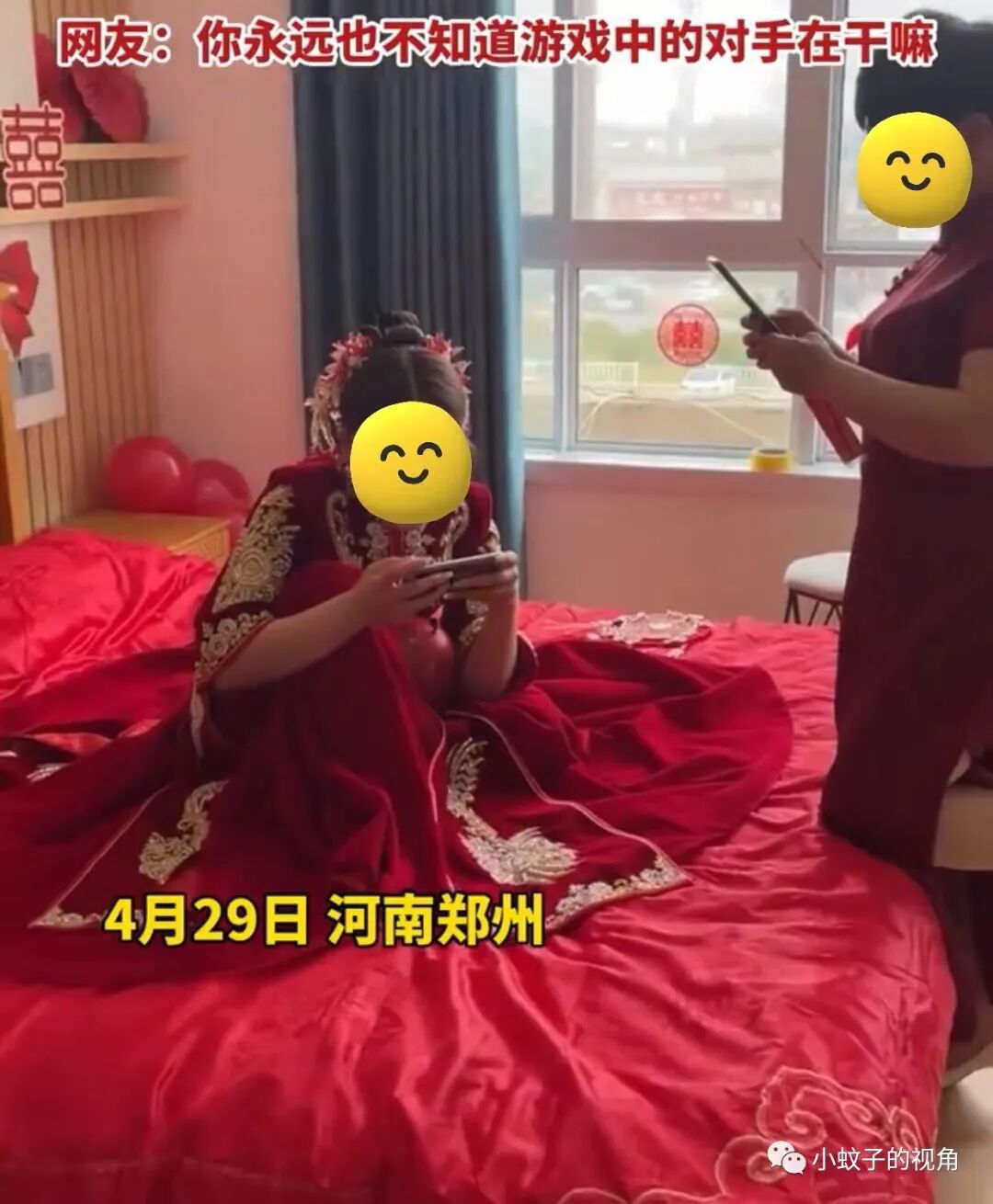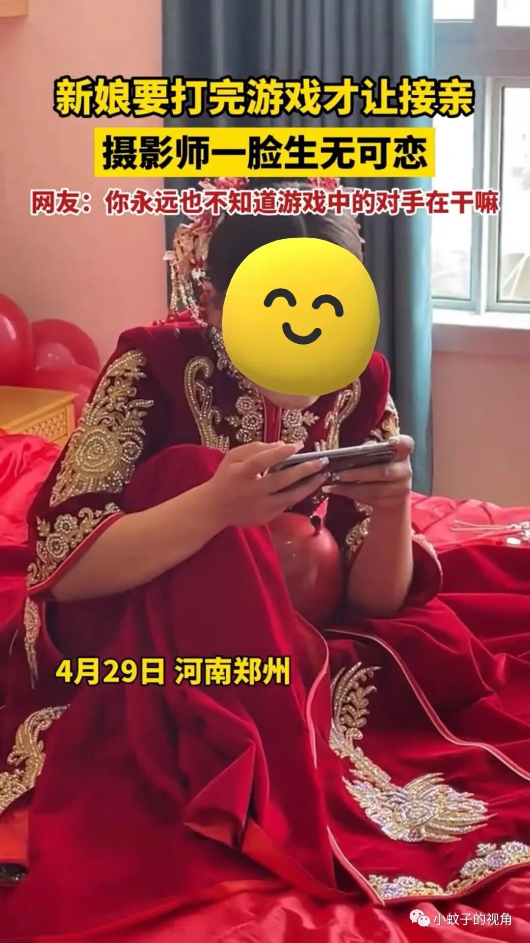 别人都在替她着急,新娘自己一点都不着急,一边玩游戏一边让摄影师在旁边等等,等她打完这一局再接亲,摄影师再开始拍摄。