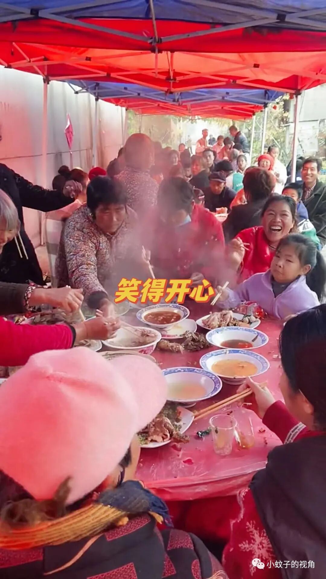 吃饭的时候都是露天酒席,哪怕在寒冬腊月也是在院子里吃,亲朋好友说说笑笑,孩子们在一起追逐打闹,一派欢乐热闹的景象。