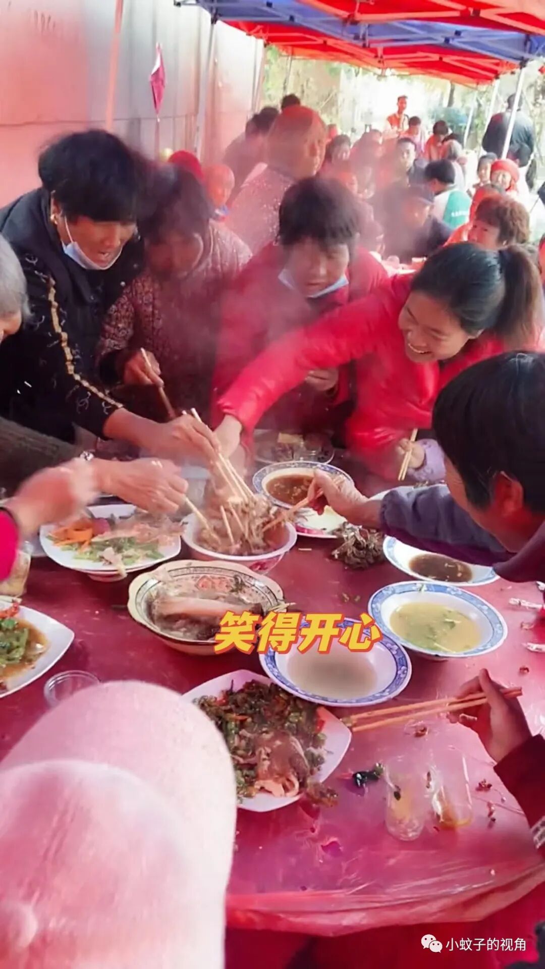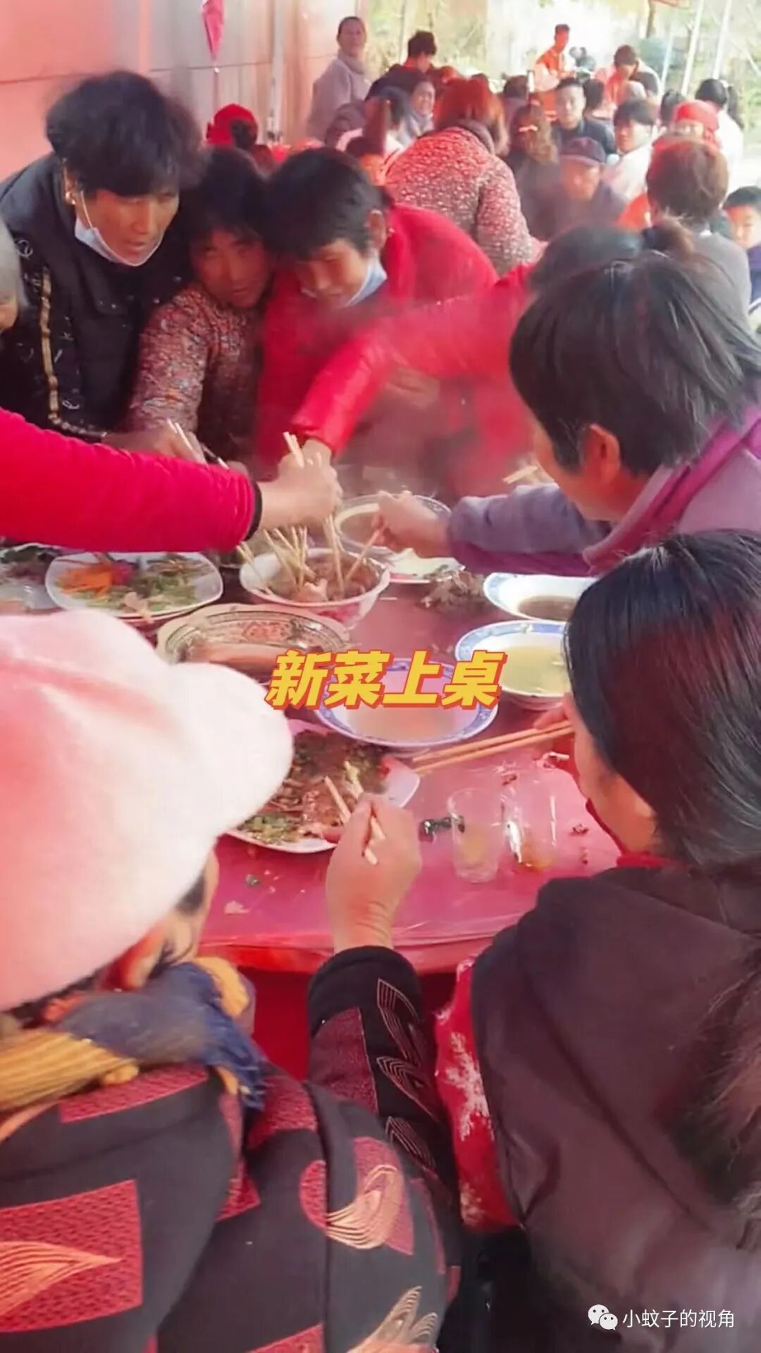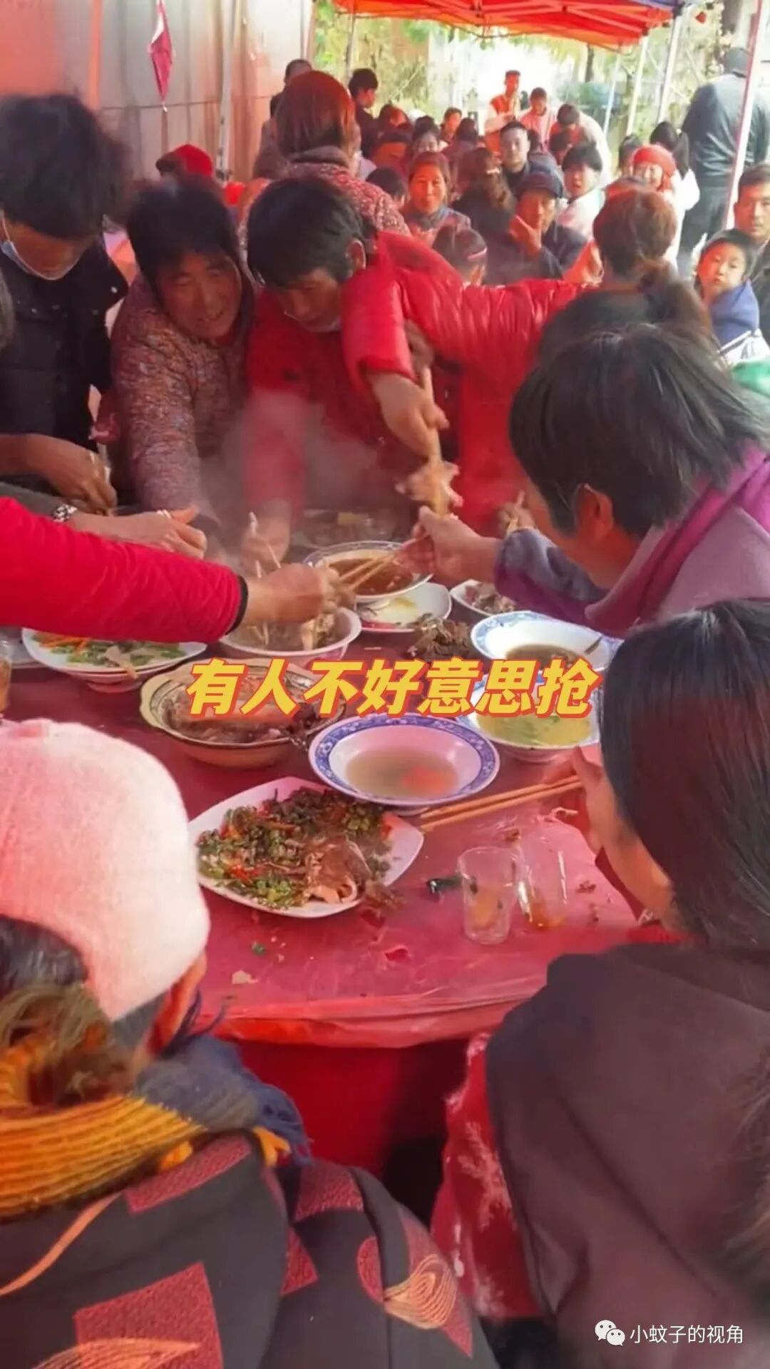 就像这名女子一样,她第一次去农村吃露天酒席,记录下酒席上的一幕,忍不住说:真是大开眼界,第一次见这样的场面,吃饭都得抢!