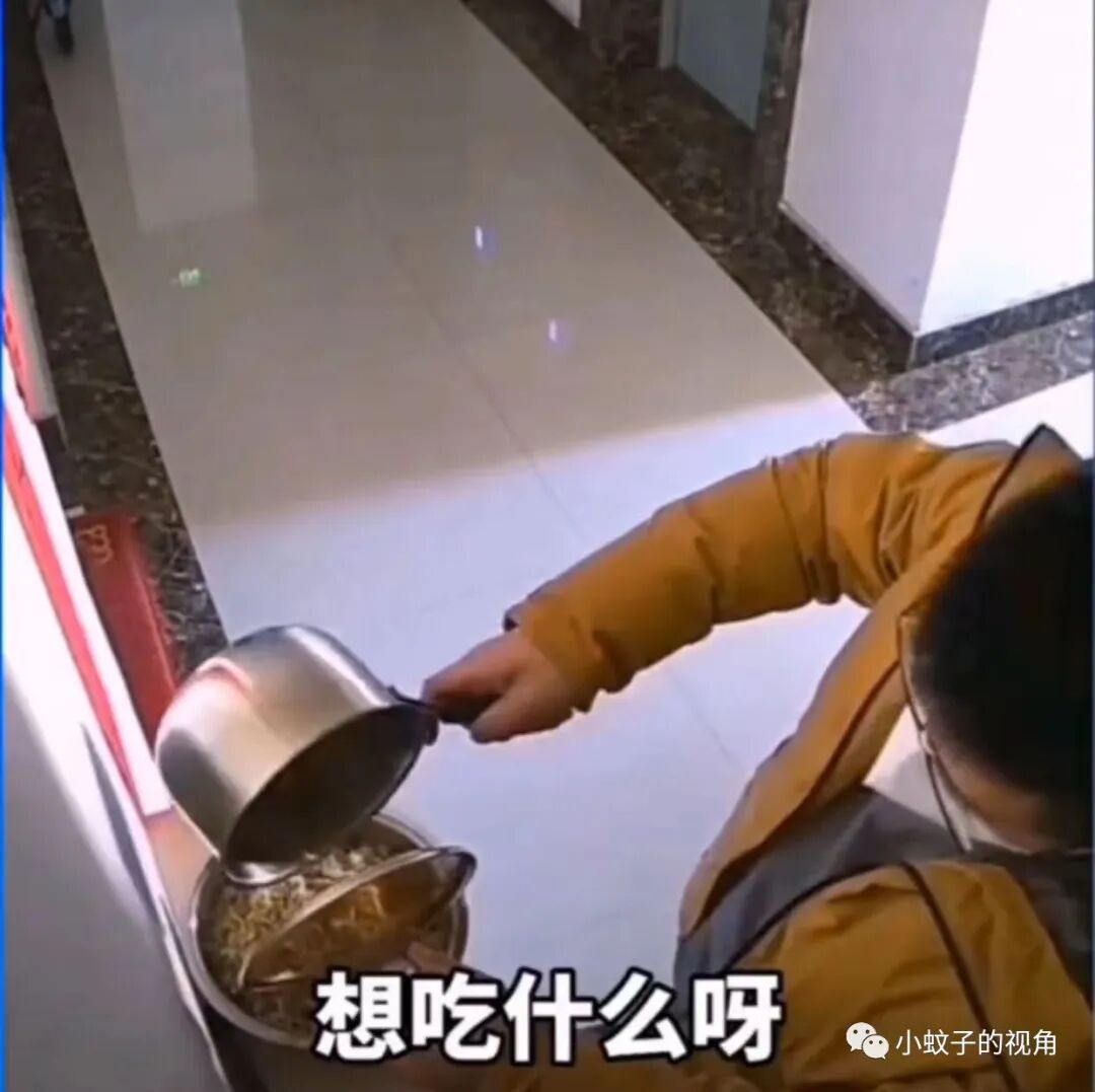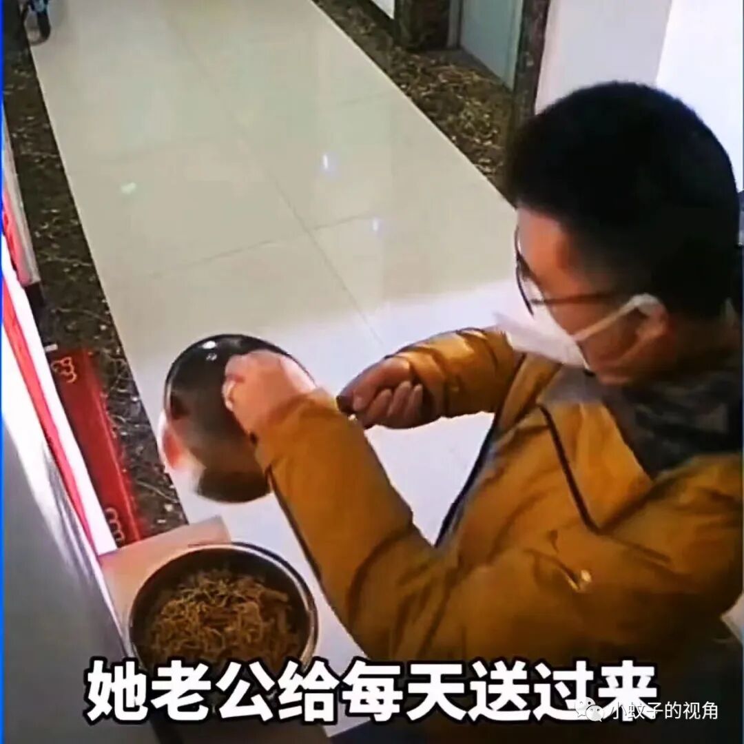 为了防止交叉感染,她老公送饭的时候也戴着N95口罩,把饭菜倒进饭盆里后就赶紧离开。