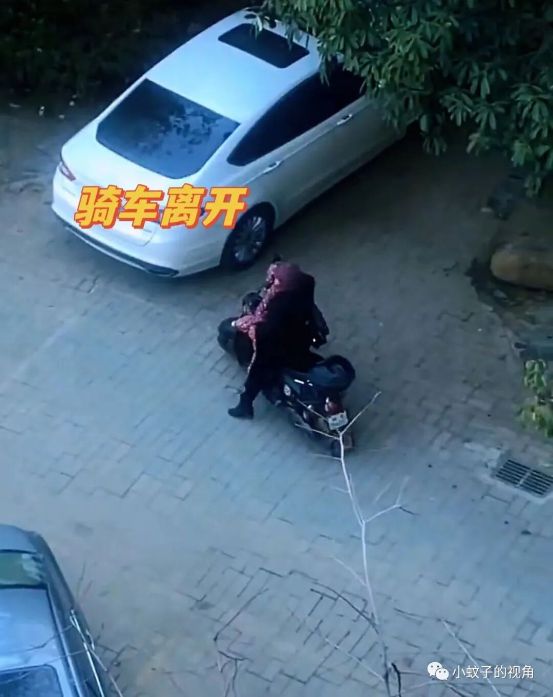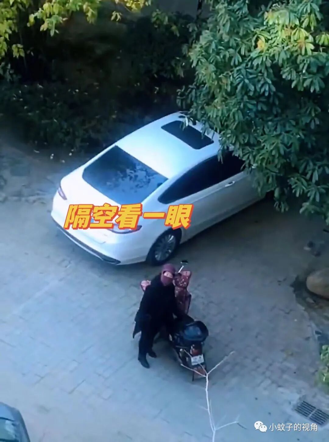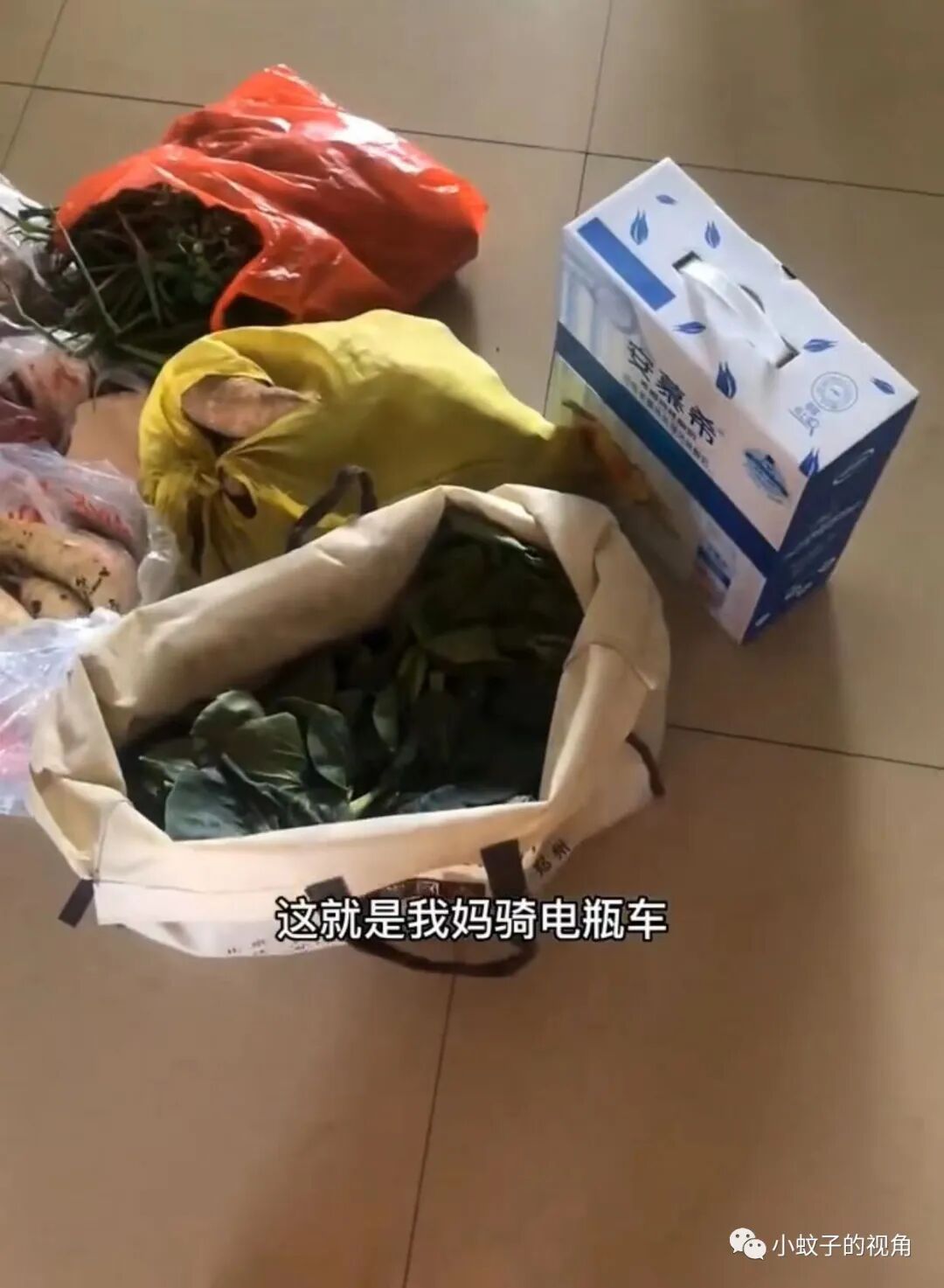 从窗户看下去,妈妈包裹得严严实实,骑着电动车来了,手里还拎着一大堆物资,正弯着腰拎东西呢!