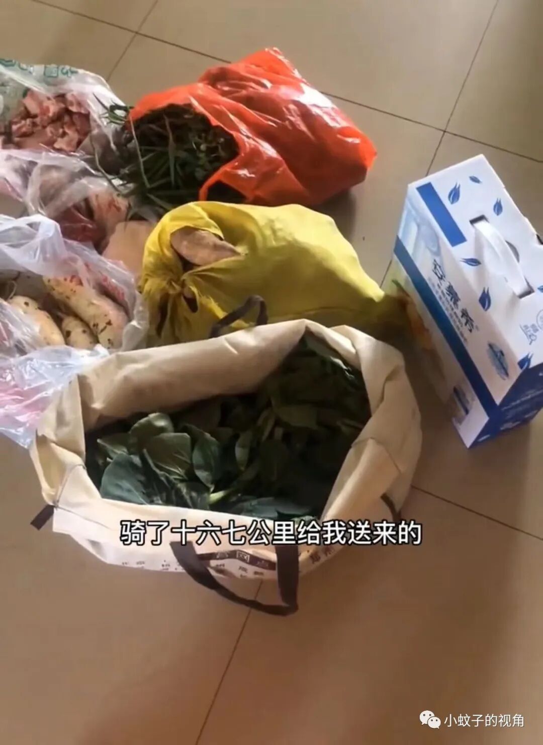 妈妈送来的东西有酸奶、蔬菜、肉等,都是平时过日子要吃、要用的。放在门口就走了,一点都没有跟孩子接触。