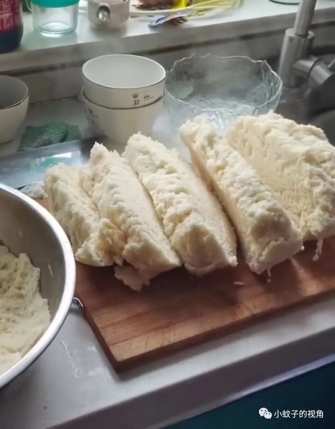 没办法,他只好将整个面团一起取出来,切开后当成馒头吃。盆底粘的面团取不下来,也只能这样了!