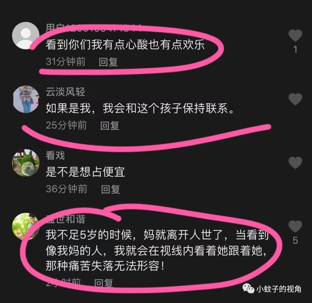 还有网友现身说法,道:我不足五岁的时候,妈妈就离开人世了,每当看到像我妈的人,我就会在视线内看着她,跟着她,那种痛苦和失落无法形容。