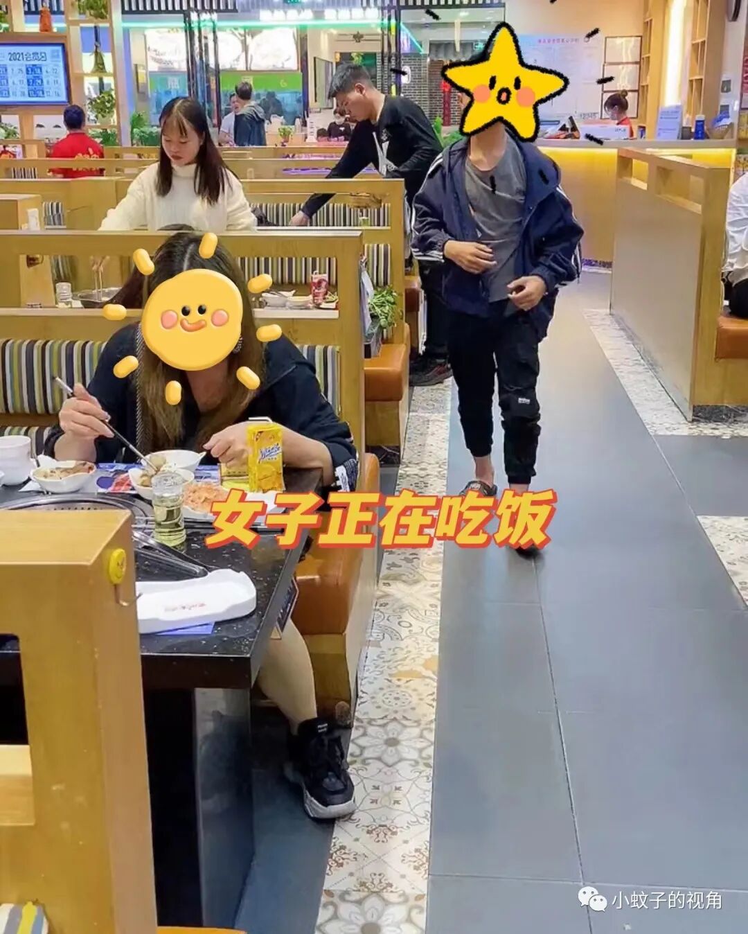 一名女子正在自助餐厅吃饭,餐厅里人来人往,都没有引起她的注意,只顾跟朋友吃得开心。