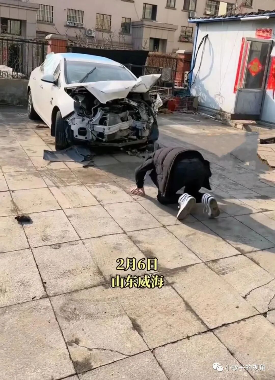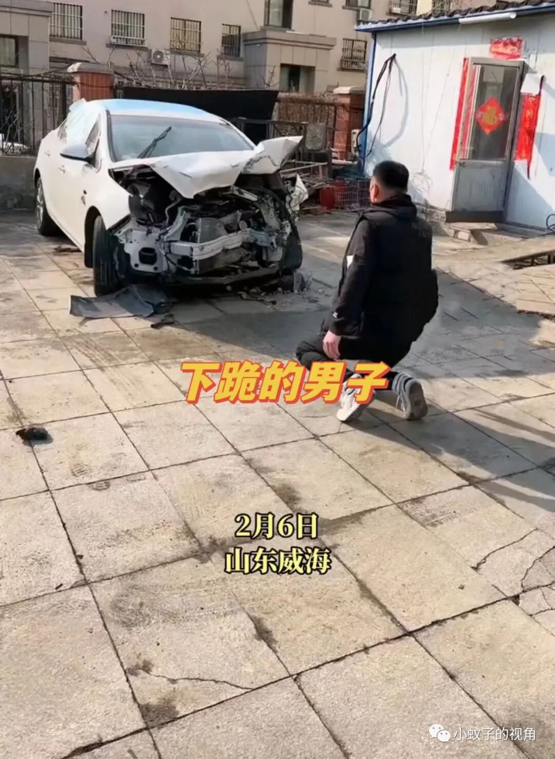 据这位网友介绍,跪在地上的这位男子是她老公,他面前的这辆白色轿车已经要报废了。