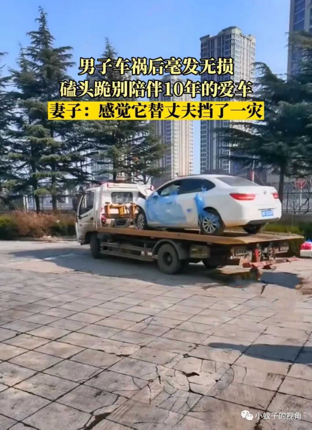 对着将要被拉走的车子,男子跪下来磕头道:“谢谢你这些年的陪伴,也谢谢你跟我一起养活了一家人,更谢谢你在出车祸的时候保了我一命!”