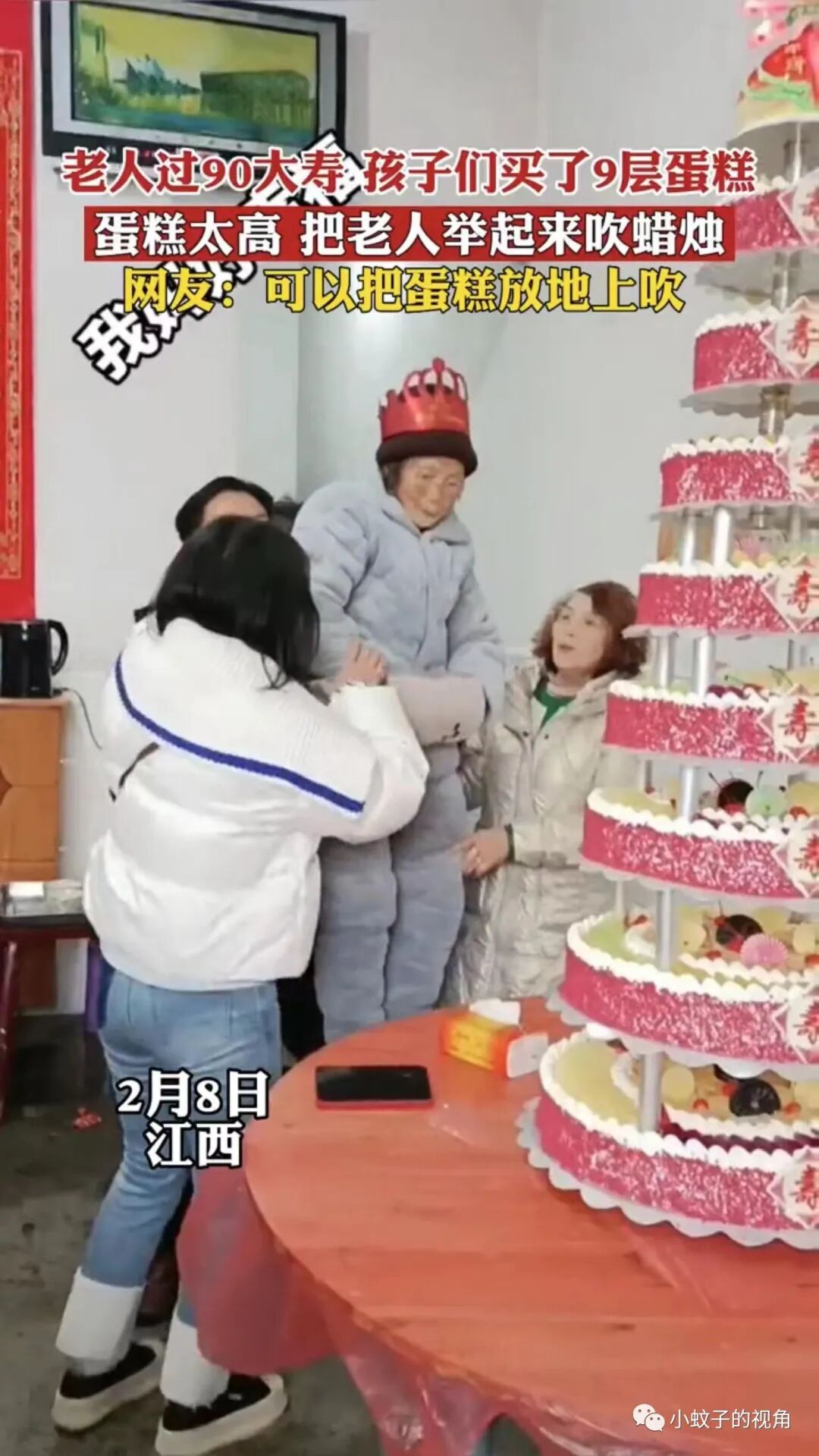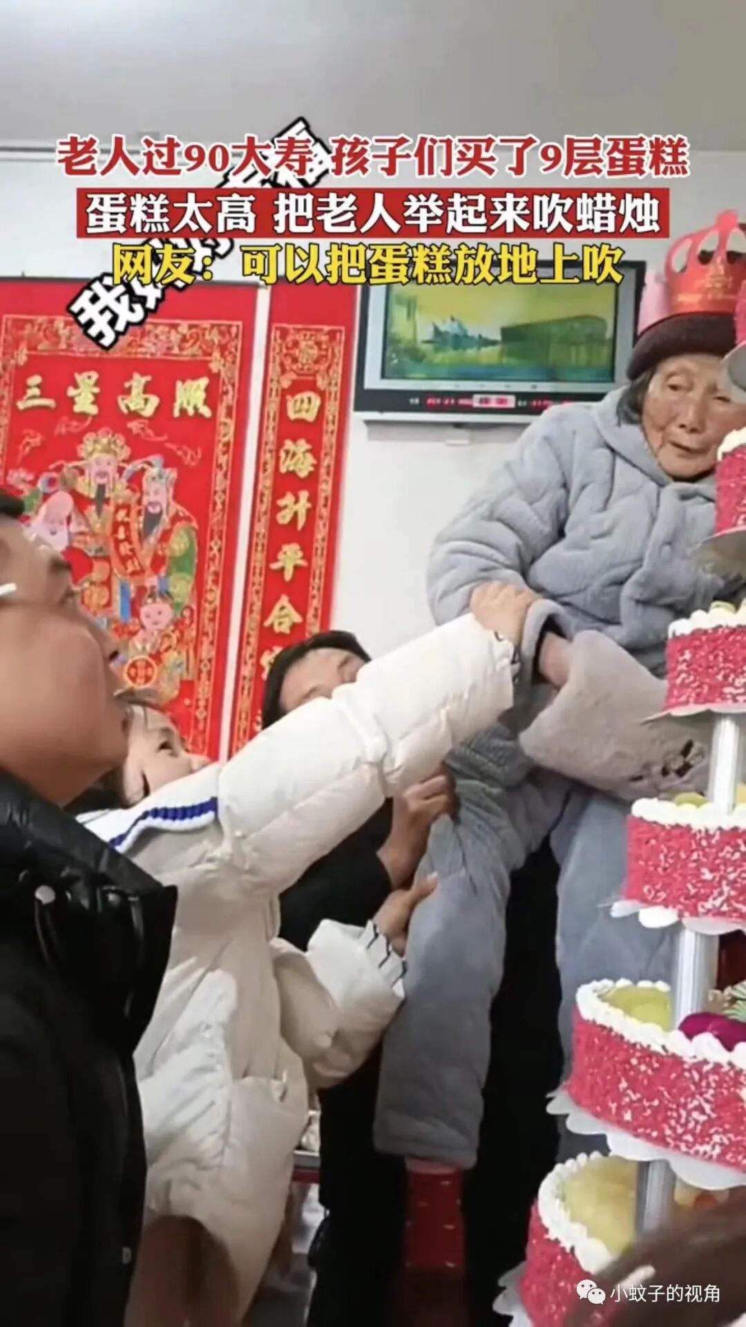 就像这位老人一样,她已经90岁高龄了,过大寿的时候由于蛋糕太高,儿孙们只好将她抱上餐桌吹蜡烛。