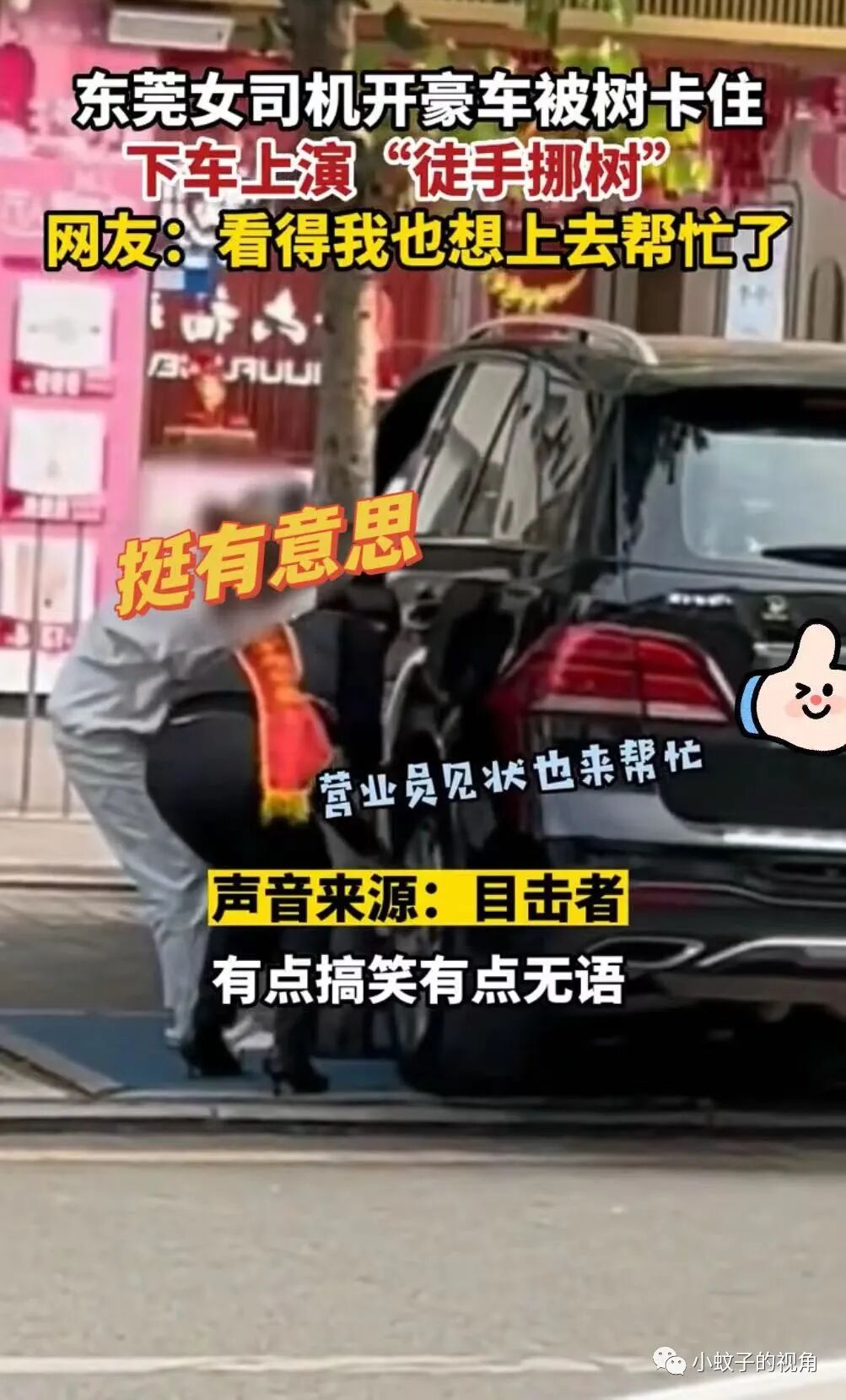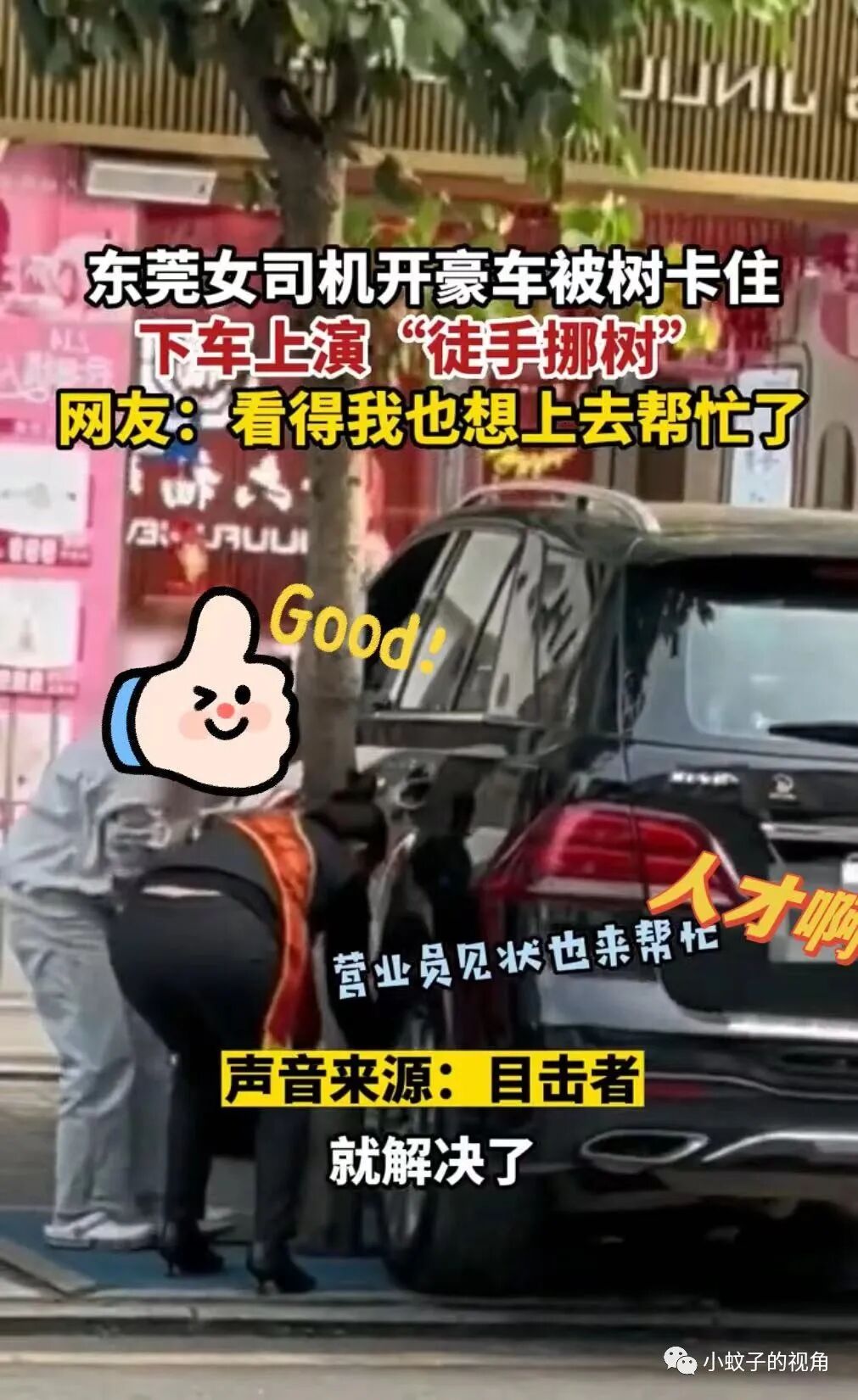 就像东菀的这名女司机一样,开着豪车在停车的时候不小心被大树卡住了,她不是倒一把方向盘,而是下车后试图“徒手挪树”,场面看了令人迷惑。