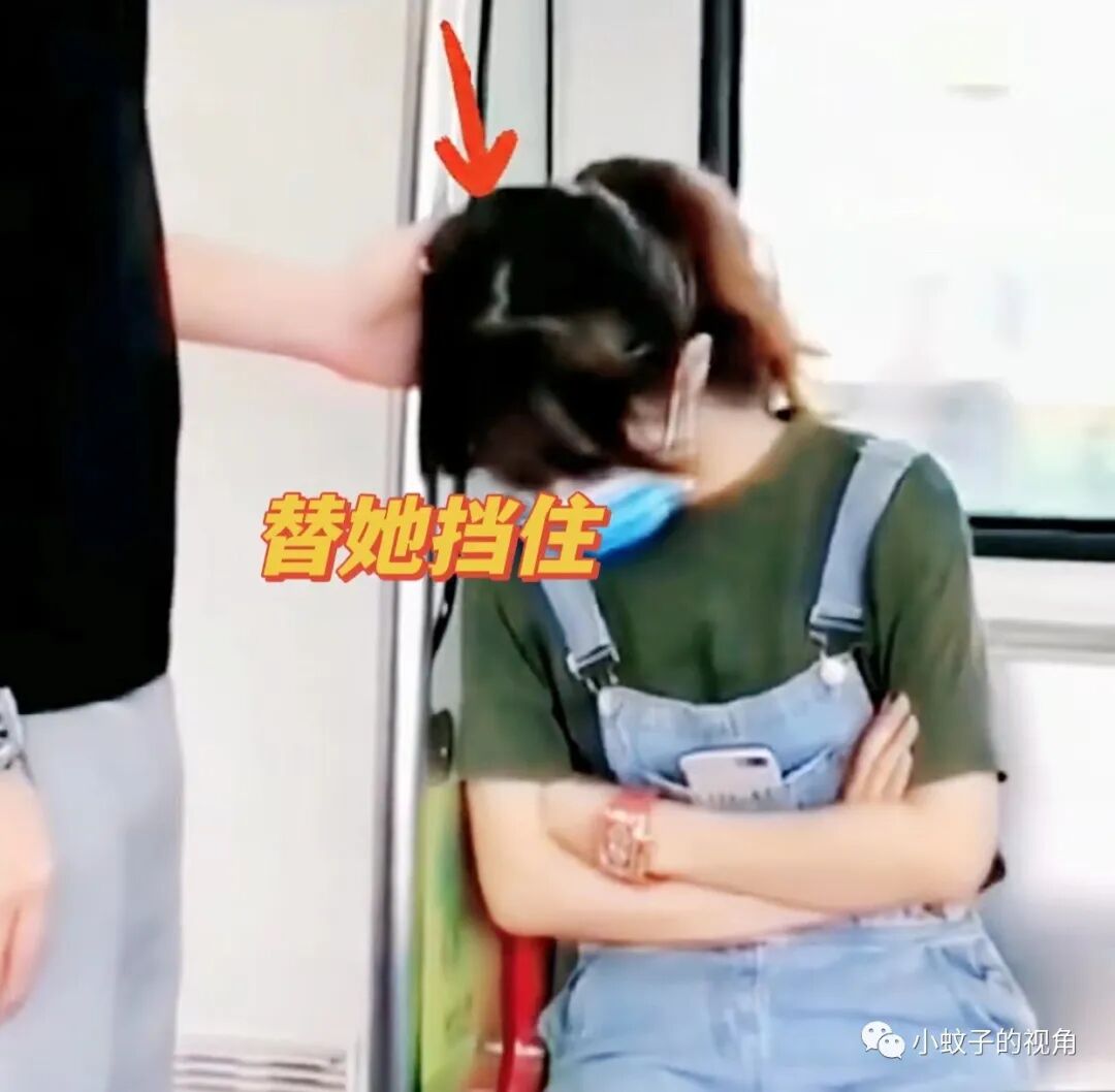 墙壁的附近正好有个扶手,一名身穿黑色T恤的男子正用手抓着扶手,女子瞌睡的脑袋正好撞在男子的手上。