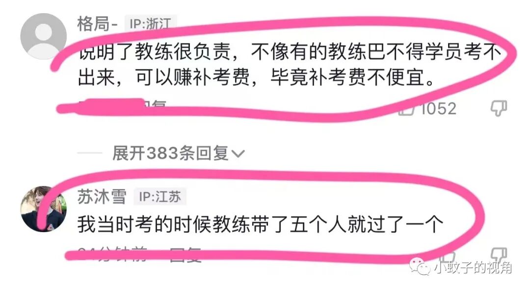 网友看了忍不住大笑,说:这说明了教练很负责,不像有的教练巴不得学员考不出来,可以赚补考费,毕竟补考费不便宜。