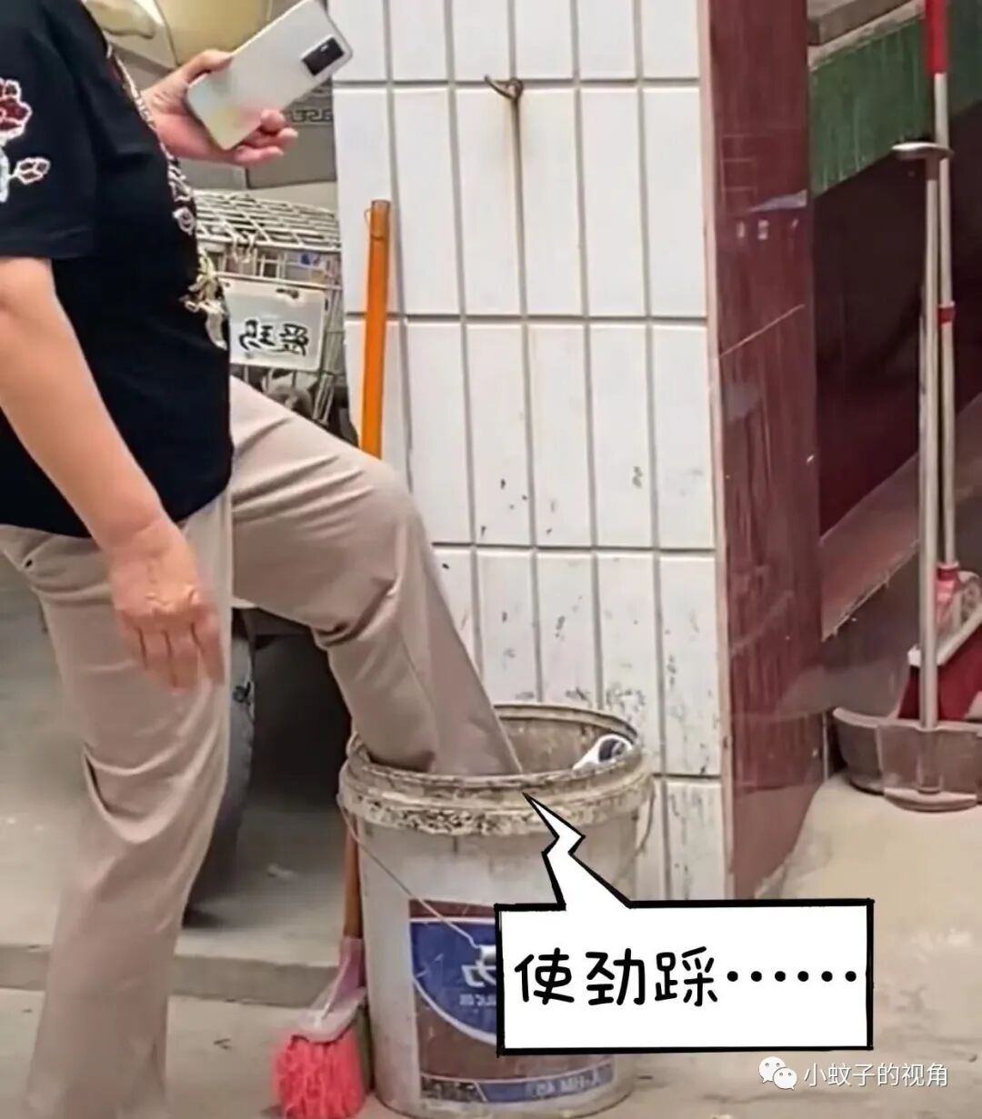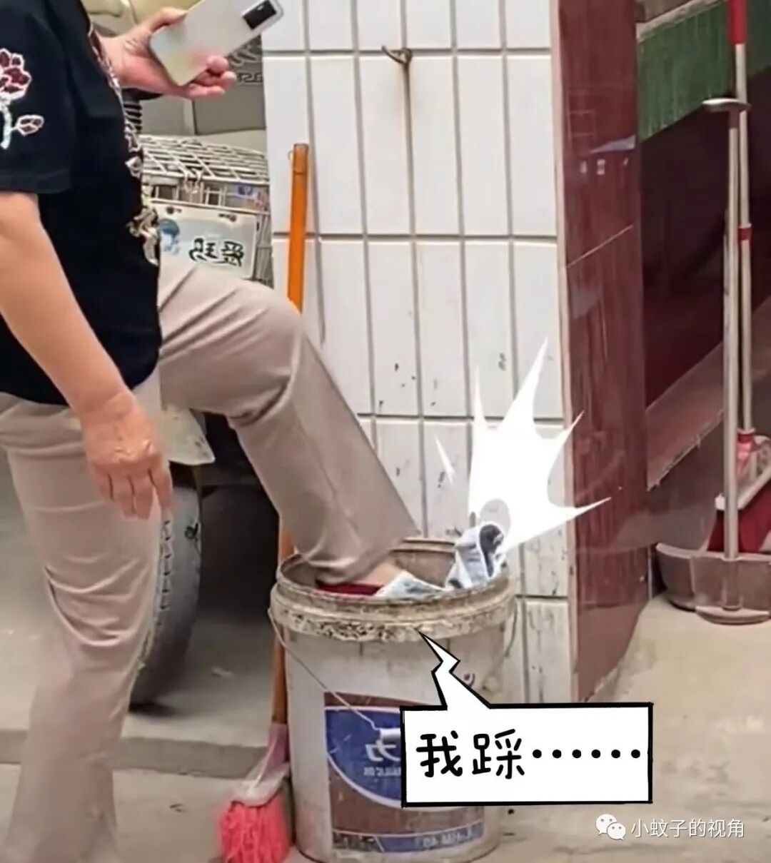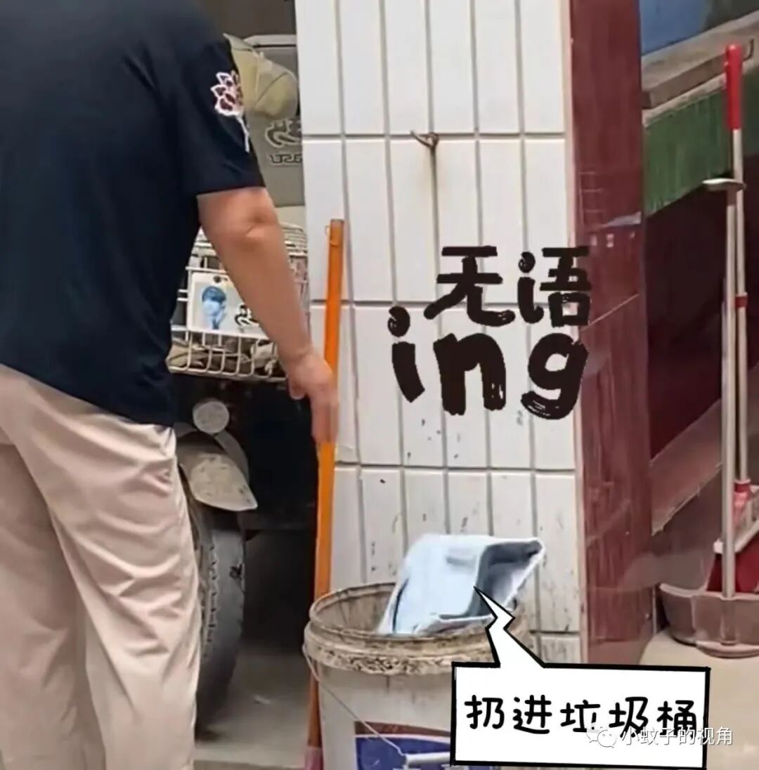 扔进垃圾桶还不算完,看着这条短裤还在垃圾桶上面支棱着,抬起一条腿,用脚往里踩了踩,表情好像在说:我让你穿!