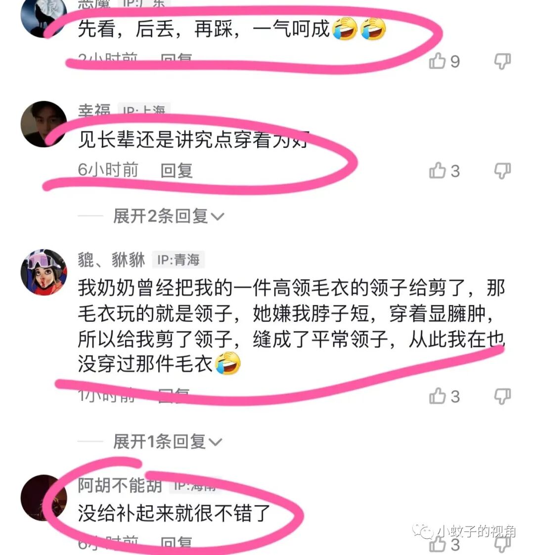 还有网友拿出自身经历说事,她说:我奶奶曾经把我的一件高领毛衣的领子给剪了。那毛衣玩的就是领子,她嫌我脖子短,穿着显臃肿,所以给我剪了领子,缝成了平常的领子。从此,我再也没穿过那件毛衣。