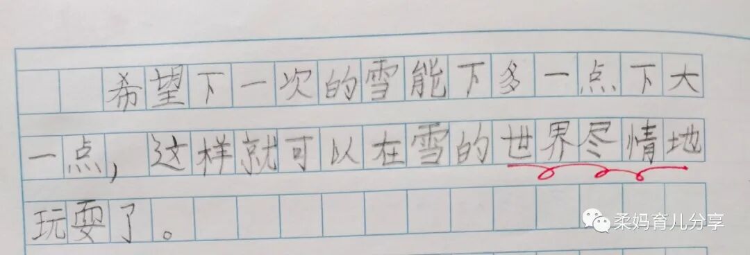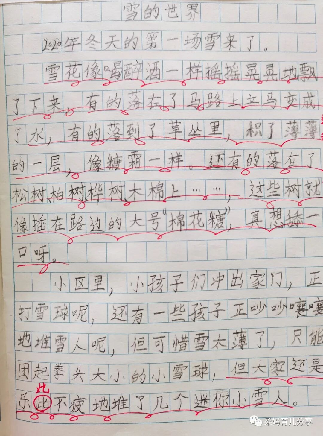 柔同学现在三年级,大姑娘了,有自己的主意,不授权给我,我是不能发布她有知识产权的任何东西的,包括文字、声音、画儿等等,如果我偷偷发布被她发现,那她就要找我理论了,说我不尊重她。今天我运气不错。学校今天期末考试刚考完语文,轻松了,小丫头心情不错,欣然同意我发布一篇她的“大作”,然后自己选了学校平时的习作《雪的世界》。我以为她会选满分的那篇,但她说:“这篇虽然离满分30分还差1分,但我非常喜欢,用了很多拟人和比喻,老师给我划出来很多好句子!”
