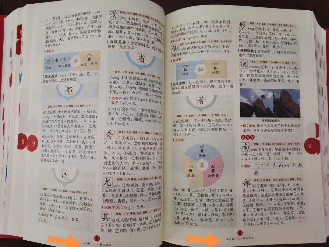 内页是这样的↓ 注意页面最下方,注明本页的字来自语文书哪册第几课,非常便于查找和定位。这整本手册就是按照语文课本的顺序编排的,彩色有配图,实用。让孩子自己查找,可以培养独立学习的习惯,页和缓陪伴的紧张气氛。