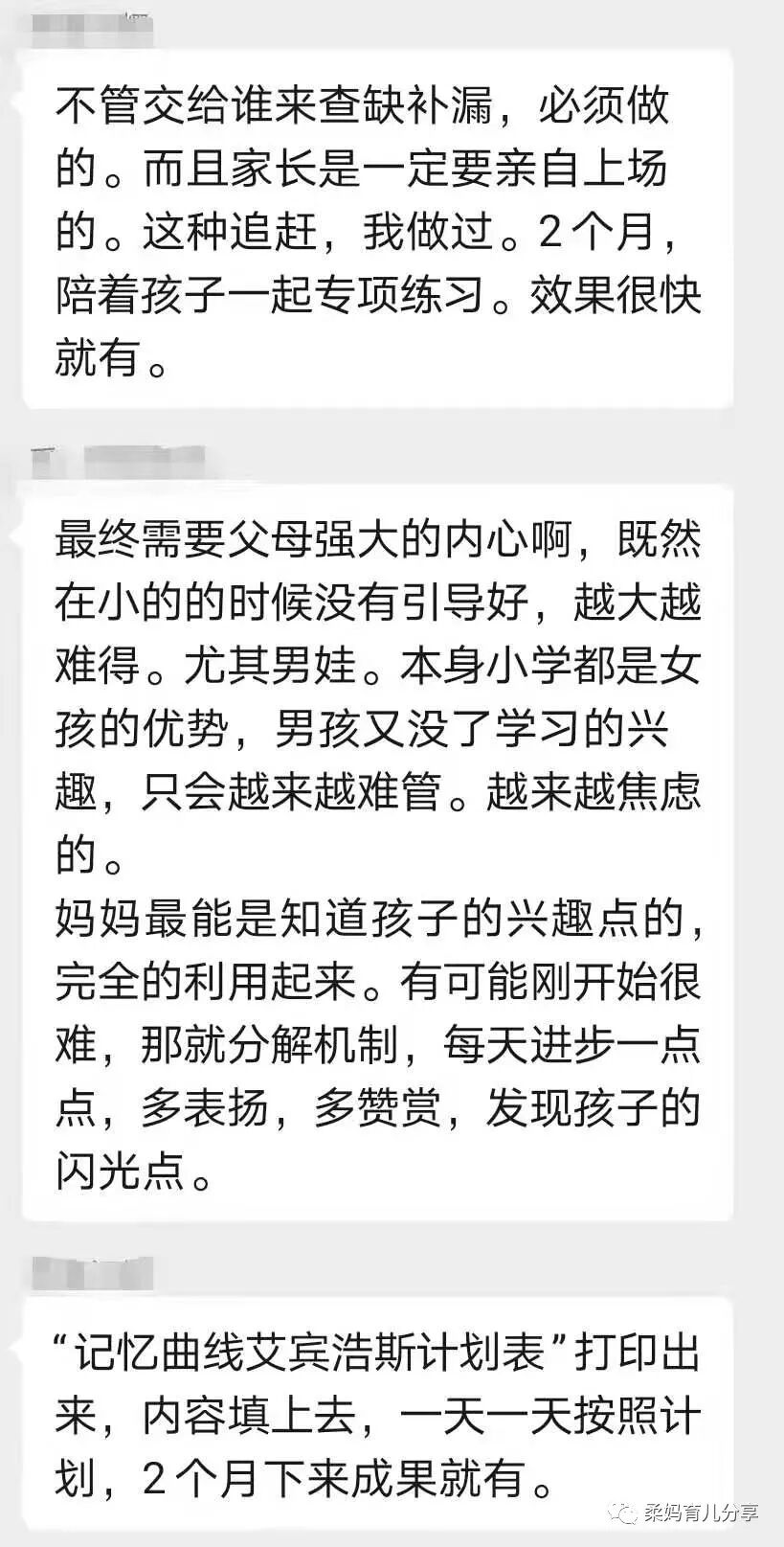 后来我把这个情况跟群里家长说了一些,请大家为这位麻麻出出主意,有类似情况的群友们纷纷现身说法: