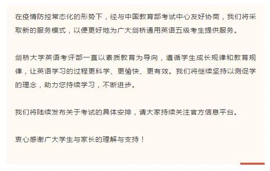 回复很清楚:今年会有考试的,将陆续发布具体信息。以后的具体信息就直接看剑桥英语考试的官网了http://mse.neea.cn/。