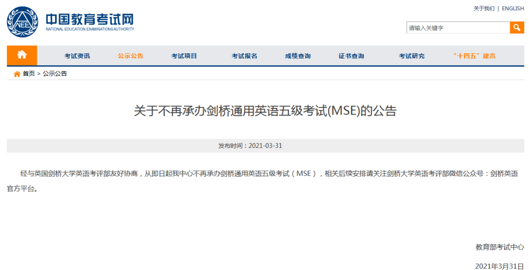 自从3月31日,教育部考试中心官网发布了《关于不再承办剑桥通用英语五级考试(MSE)的公告》后,不知道大家的心情如何?