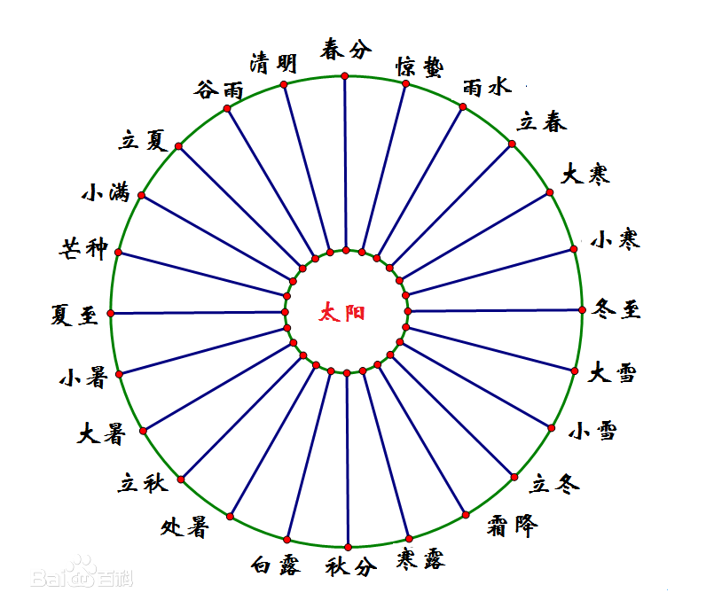 即在一个为360度圆周的“黄道”(一年当中太阳在天球上的视路径)上,划分为24等份,每15°一等份,以春分点为0度起点,按黄经度数编排。即,视太阳从春分点,也就是黄经零度出发,此刻太阳垂直照射赤道,每前进15度为一个节气;运行一周又回到春分点,为一回归年,24个节气正好360度,太阳在黄道上每运行15度为一个“节气”。