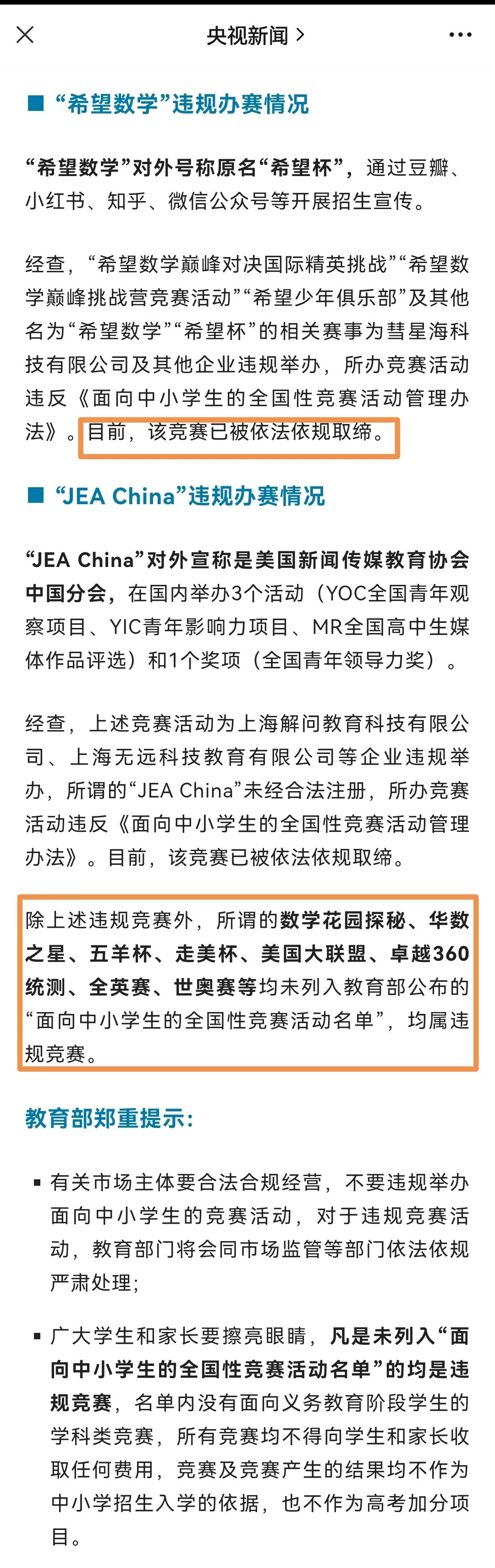这是来自央视新闻这些中小学生竞赛违规,教育部通报的截图: