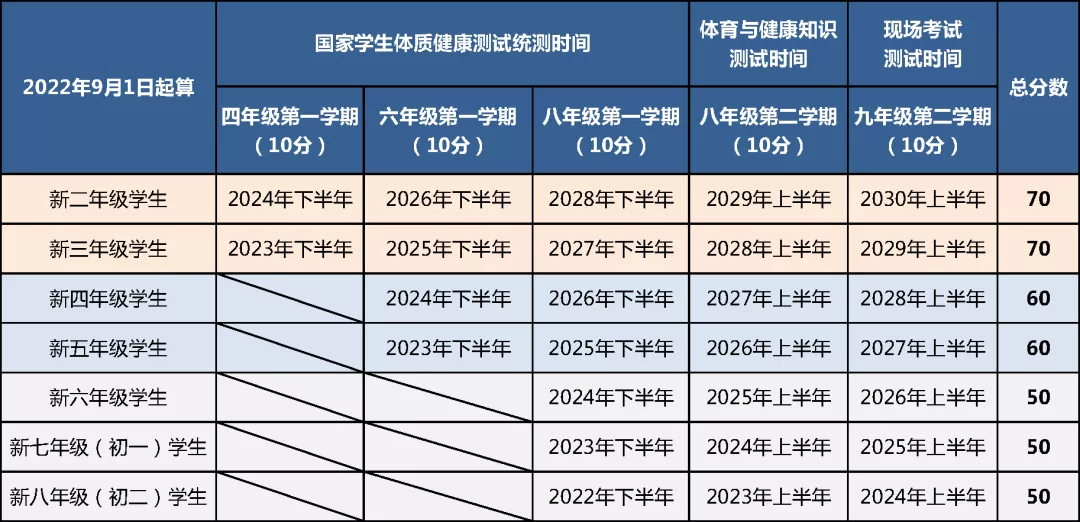注意啦,目前3年级及以下的孩子,情况还有不同。这些孩子的体育中考满分为70,分配在五个时段获得: