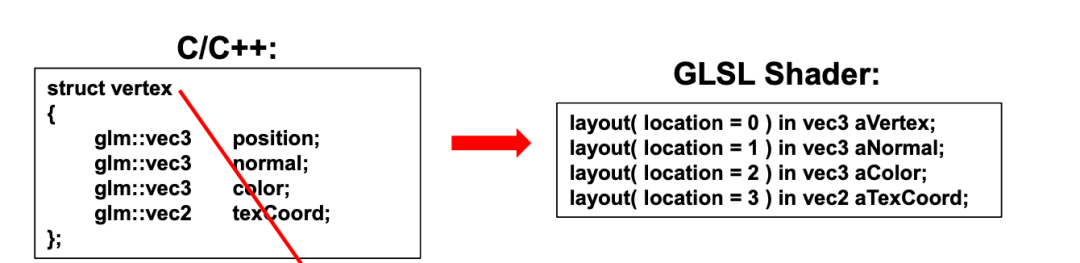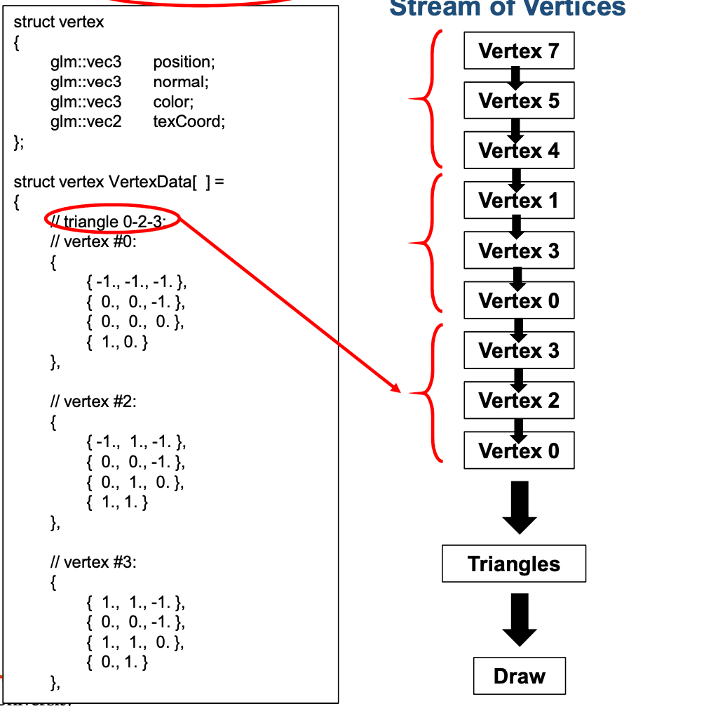 struct vertex{ glm::vec3 position; glm::vec3 normal; glm::vec3 color; glm::vec2 texCoord;};#endifstruct vertex VertexData[ ] ={ // triangle 0-2-3: // vertex #0: { { -1., -1., -1. }, { 0., 0., -1. }, { 0., 0., 0. }, { 1., 0. } }, // vertex #2: { { -1., 1., -1. }, { 0., 0., -1. }, { 0., 1., 0. }, { 1., 1. } }, // vertex #3: { { 1., 1., -1. }, { 0., 0., -1. }, { 1., 1., 0. }, { 0., 1. } }, … };