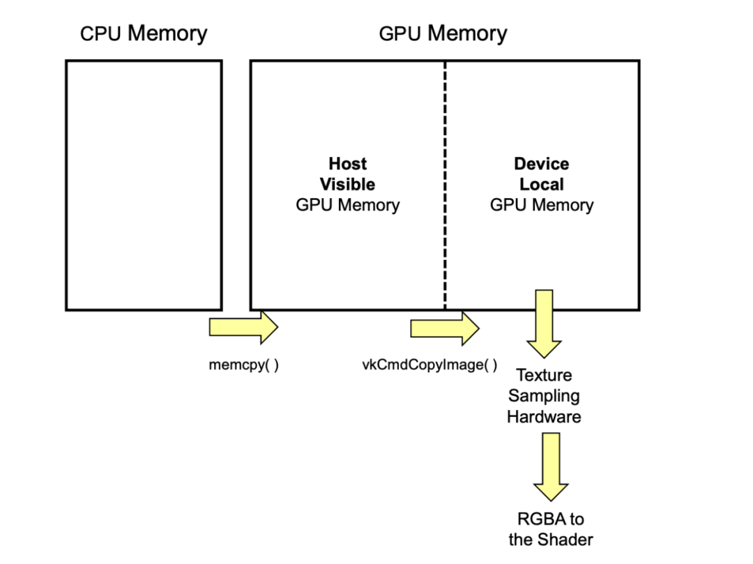 让我们回到Vulkan,先说内存类型,首先分为CPU内存和GPU显存,GPU显存则分为主机内存(Host Visible Memory)和设备内存(Device Local Memory)。CPU可以向主机内存进行读写操作。设备内存是一种设备可见的内存,常见的缓冲内存和图像内存,可以被设备本地快速使用,而设备内存最大的用处就是储存纹理,因为纹理读取是需要快速完成的。