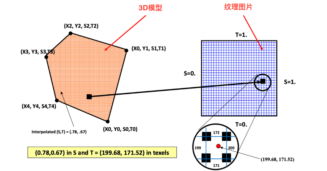 映射原理:带有纹理坐标的3D模型会在每个顶点都有ST纹理坐标,由纹理坐标找到对应应该在屏幕显示的纹理中纹素位置,如下图: