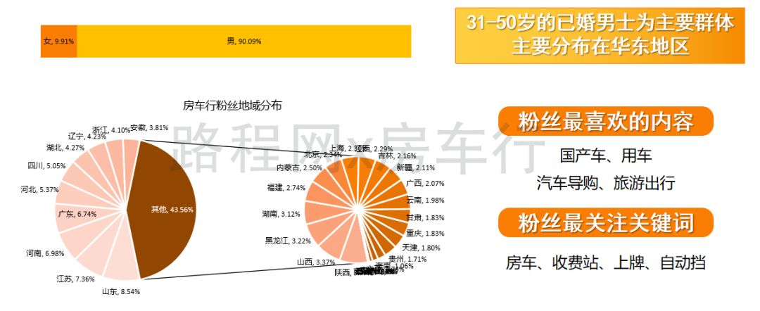 最后再来说一下房车的受众人群,目前路程网x房车行在今日头条、微信、微博、百家号等平台拥有多个账号,并在今日头条建有自媒体矩阵,包括路程网、房车行、房车展、房车行超市 、房车视频、房车视界、露营世界等账号,目前合计粉丝近800万,今日头条系粉丝已超500万,抖音及西瓜视频2020年总播放量已超10亿,每月房车行业内容有2亿+月PV值,30亿+总PV值,传播覆盖近5亿人。