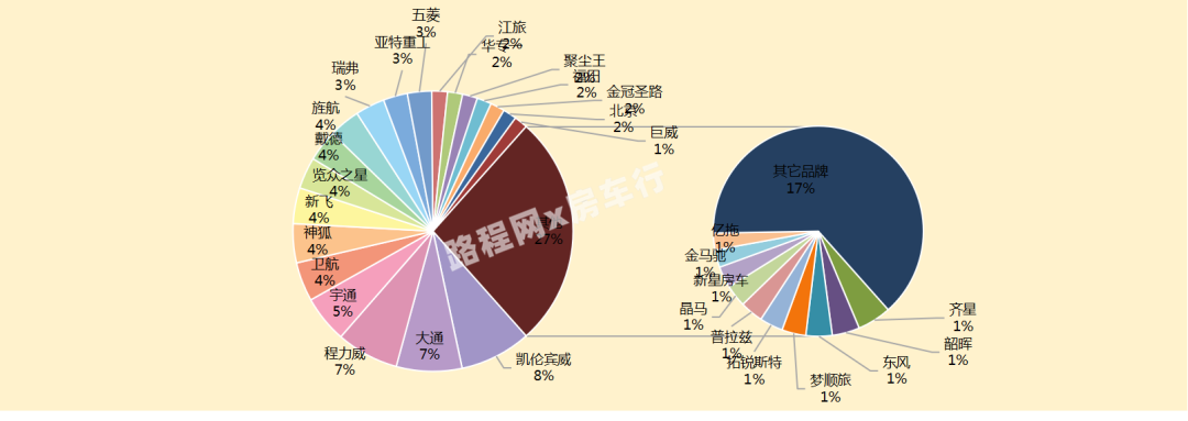 以目前已有的自行式房车销量数据统计来看,2020年排名前十五的产品依次为:凯伦宾威牌、大通牌、程力威牌、宇通牌、卫航牌、神狐牌、新飞牌、览众之星牌、戴德牌、旌航牌、瑞弗牌、亚特重工牌、五菱牌、江旅牌、华专一牌。