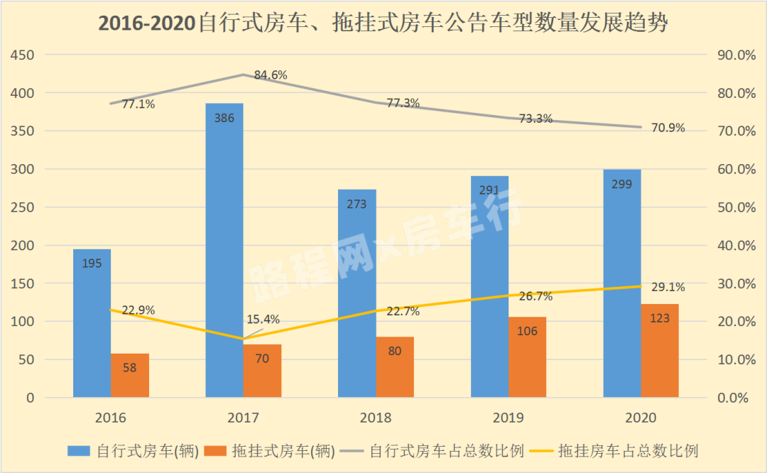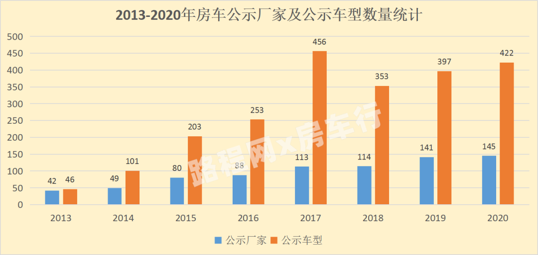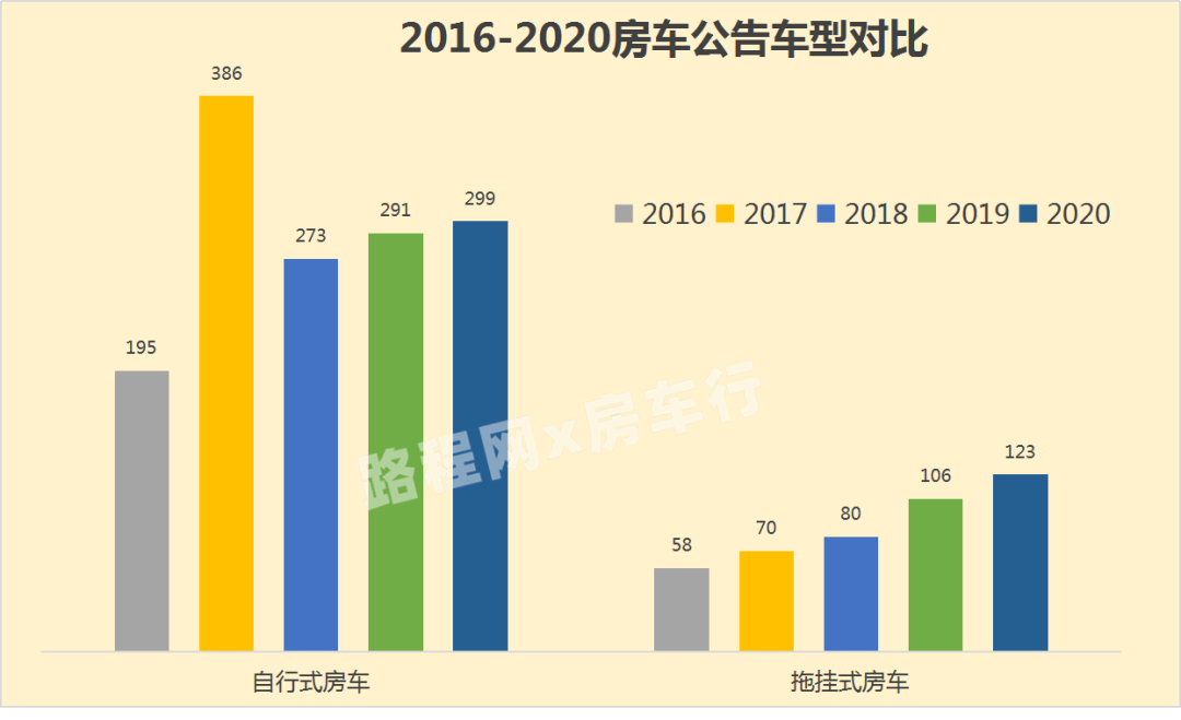 而从2020年房车公告车型数量来看,2020年工信部共发布了12批旅居车公告,自328批-339批,共有145家厂家申请了422款车型公告,其中包括297款自行式房车、123款拖挂房车以及2款插电式混合动力旅居车。与2019年相比,有明显增长,这表示房车行业整体发展趋势仍然向好。