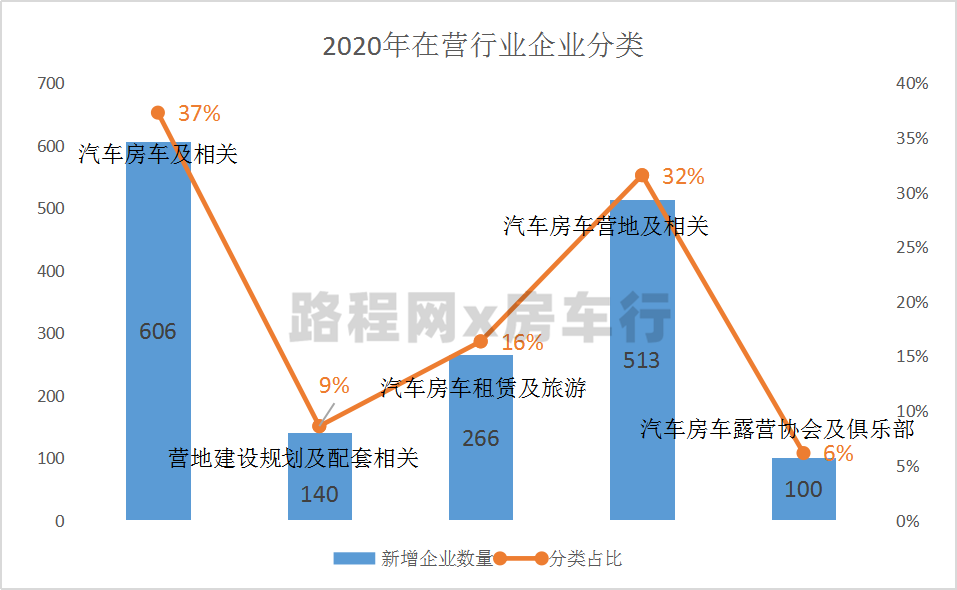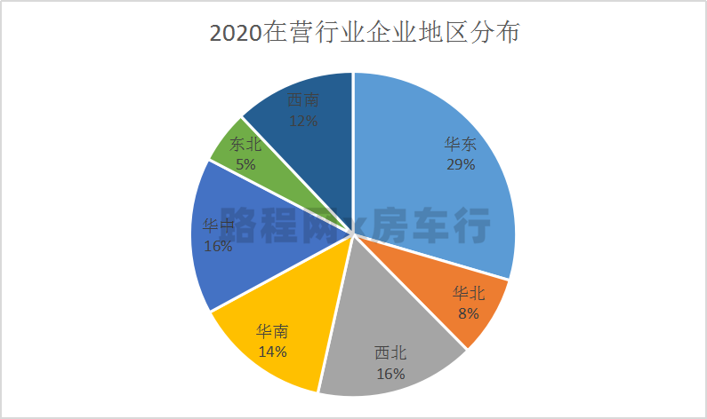 另外,截止至2020年,全国共有9144家行业企业(2011年前共注册551家),2020年新注册行业企业数达1625家,新注册行业企业数类型整体相差不大,其中汽车房车及其相关、汽车房车营地及相关等企业注册最多,分别占整体的37%及32%,地域分布比较均匀,其中华东、西北、华中、华南等地最多。