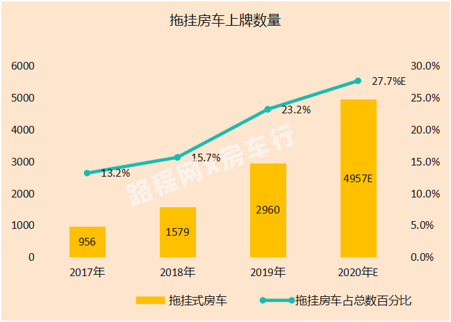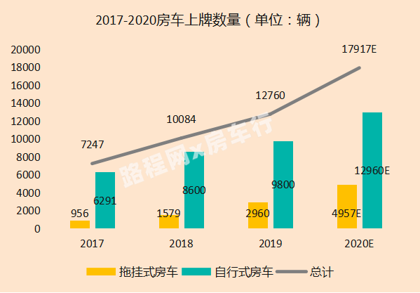 据统计预测,2020年上牌数量预测将达17917辆,其中拖挂房车上牌数量预计将达4957辆,将实现连续四年快速增长,所占比重也将越来越大,占总上牌数量的27.67%;自行式房车上牌数量预计将达12960辆,上半年虽然受疫情影响,但比2019年增长40.4%,有了明显增长。