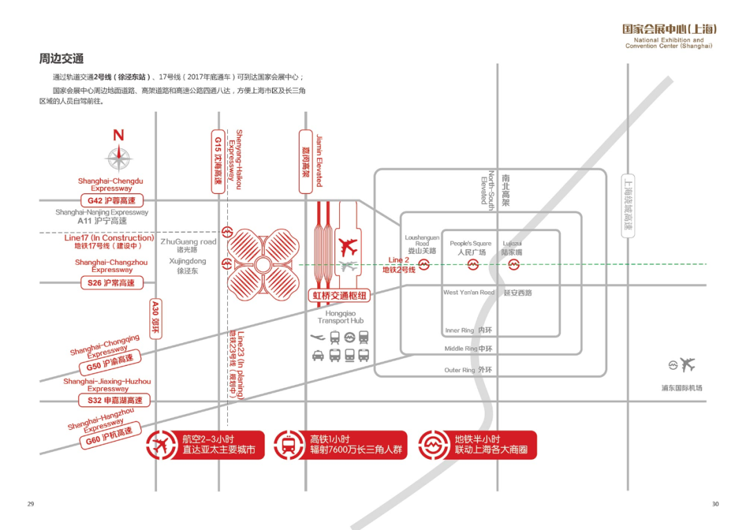 同时,国家会展中心(上海)地处上海虹桥商务区核心区西部,与虹桥交通枢纽直线距离仅1.5公里,通过空中连廊、地下通道及地铁2号线与虹桥火车站、虹桥机场紧密相连,周边高速路网四通八达,1至2小时可到达长三角各主要城市,航空2至3小时可直达亚太主要经济城市。