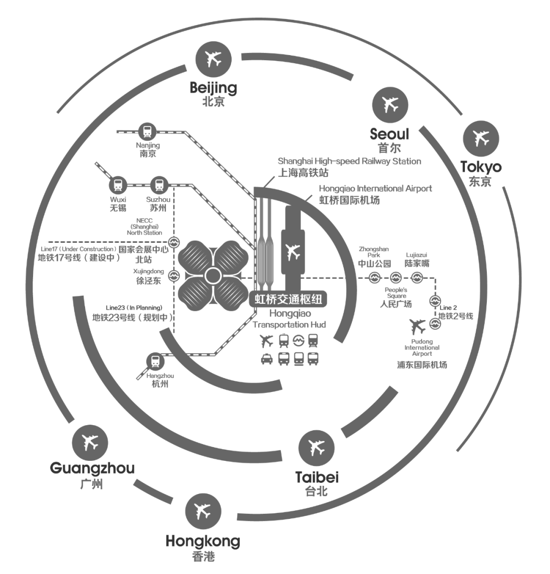 同时,国家会展中心(上海)地处上海虹桥商务区核心区西部,与虹桥交通枢纽直线距离仅1.5公里,通过空中连廊、地下通道及地铁2号线与虹桥火车站、虹桥机场紧密相连,周边高速路网四通八达,1至2小时可到达长三角各主要城市,航空2至3小时可直达亚太主要经济城市。
