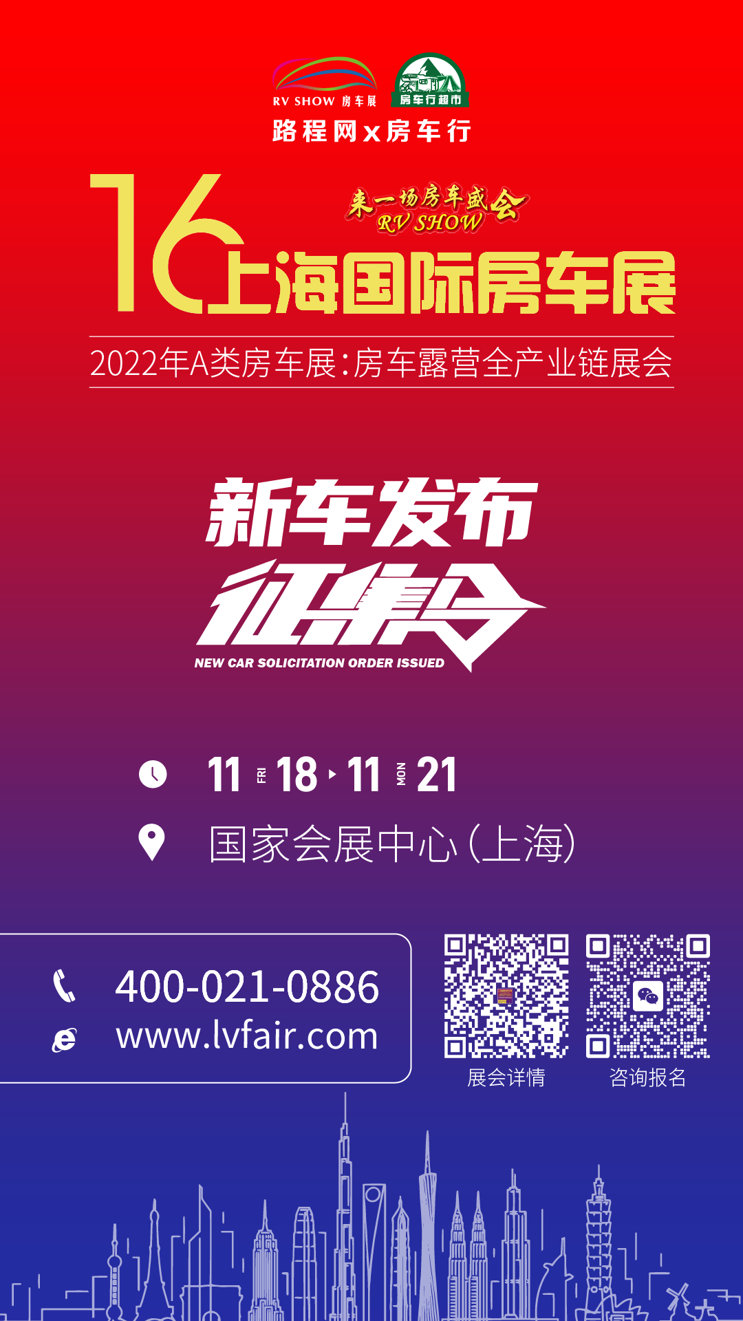 如果你有房车新款产品计划在展会现场发布,如果你想为你的展位快速聚拢人气,那么还在犹豫什么呢?快扫描下方海报中的二维码咨询报名吧!
