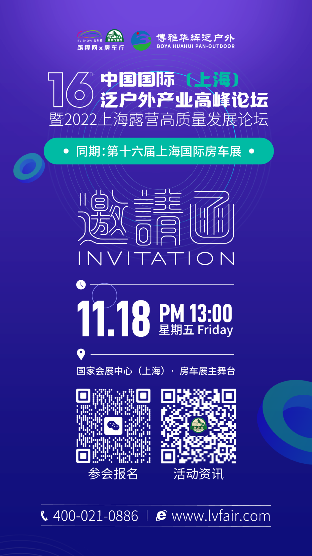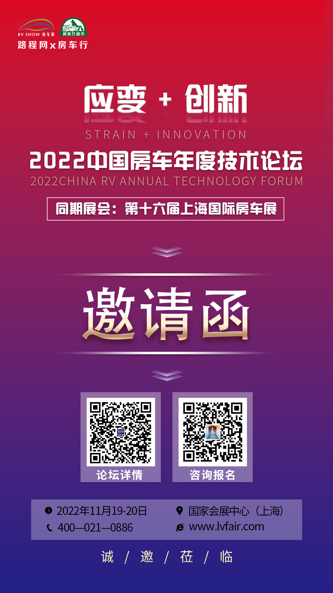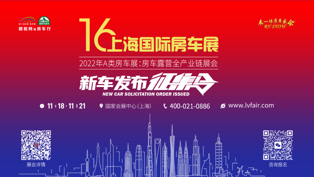 2022年,虽面临“高压”,路程网x房车行仍将砥砺前行,于2022年11月18日-21日在国家会展中心(上海)举办的2022 A类房车展-第十六届上海国际房车展将持续发挥RV SHOW房车展的行业号召力及品牌影响力,在原有的展会基础上进行革新突破,深度链接房车露营全产业链行业企业,为其搭建国际性更强、合作面更广、消费者更多、参展价值更高的专业平台。