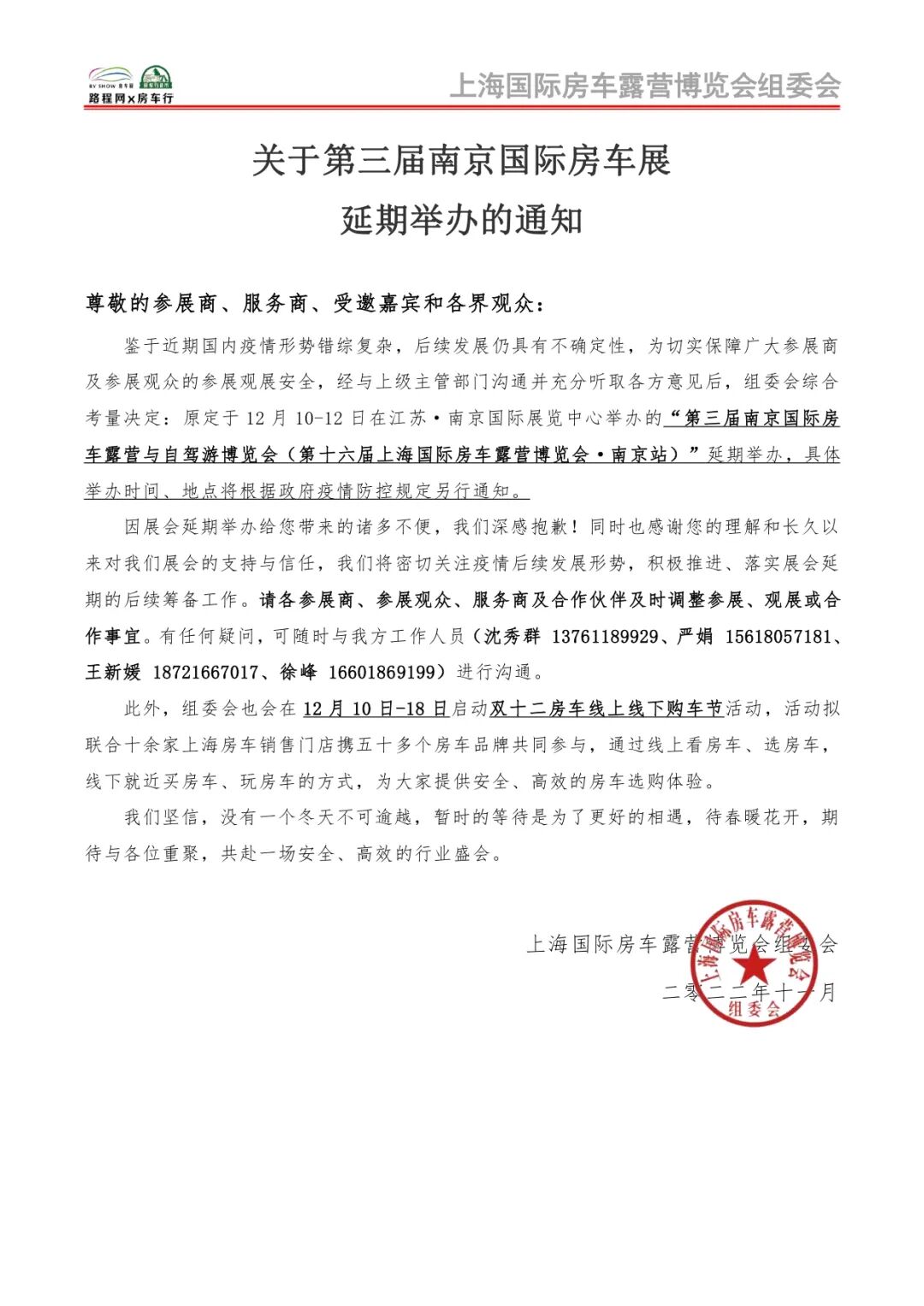 鉴于近期国内疫情形势错综复杂,后续发展仍具有不确定性,为切实保障广大参展商及参展观众的参展观展安全,经与上级主管部门沟通并充分听取各方意见后,组委会综合考量决定:原定于12月10-12日在江苏·南京国际展览中心举办的“第三届南京国际房车露营与自驾游博览会(第十六届上海国际房车露营博览会·南京站)”延期举办,具体举办时间、地点将根据政府疫情防控规定另行通知。