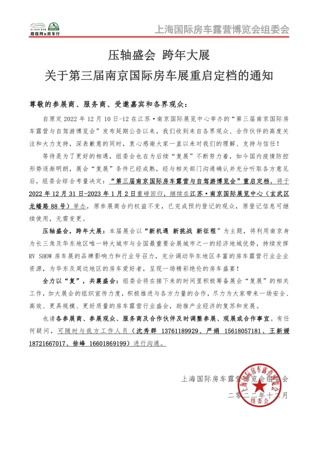 等待是为了更好的相遇,组委会也在为后续“复展”不断努力着,如今国内疫情防控形势逐渐明朗,展会“复展”条件已经成熟,经与相关部门沟通确认并充分听取各方意见后,组委会综合考量决定:“第三届南京国际房车露营与自驾游博览会”重启定档,将于2022年12月31日-2023年1月2日重磅回归,继续在江苏·南京国际展览中心(玄武区龙蟠路88号)举办,原参展商合约权益不变,已完成预约登记的观众,原登记信息可继续使用,无需变更。