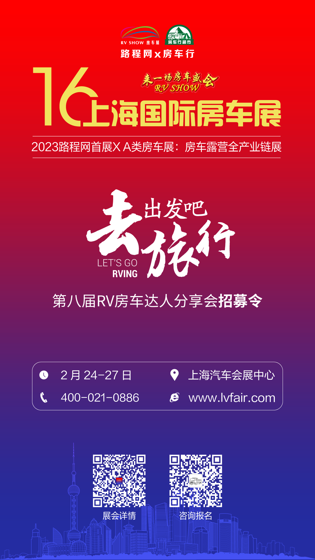 于2023年2月24日-27日在上海汽车会展中心举办的第十六届上海国际房车展(上海国际房车与露营博览会、上海国际房车配件展览会)作为路程网x房车行2023年首展,以及2023年上海首个A类房车展,将在全新的一年以更精彩的姿态与大家相见,并将继续发挥RV SHOW房车展的行业号召力及品牌影响力,持续夯实上海国际房车展身为行业风向标的引领作用,在原有展会基础上进行革新突破,深度链接房车露营全产业链行业企业,为其搭建国际性更强、合作面更广、消费者更多、参展价值更高的专业平台。
