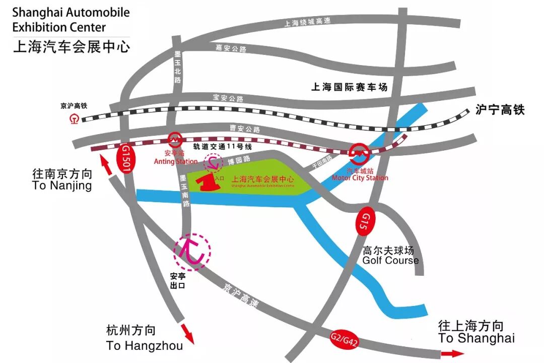 2、江苏、浙江:G1501(转至京沪高速G2/G42),往上海市区方向“安亭”出口下,博园路右转向前100m即到;