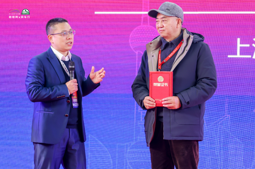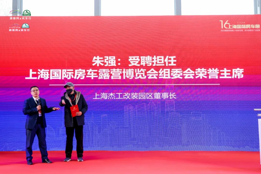 致辞结束后,路程网x房车行创始人-丁宏波先生特别邀请上海杰工改装园区董事长-朱强先生担任上海国际房车露营博览会组委会荣誉主席,并对朱强先生一直以来的支持与帮助表示感谢。