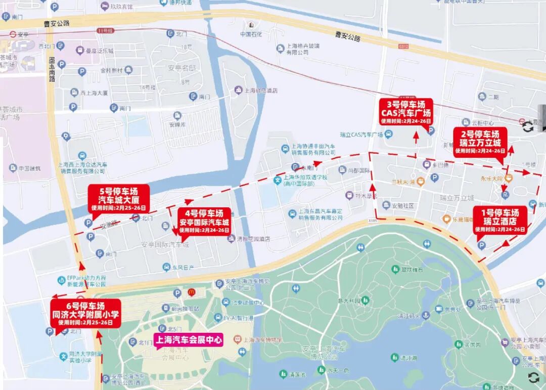 可乘坐淞安线、嘉安线、靑安线、安浏线至安亭汽车站再转乘安亭 4、6、7 路至展馆。