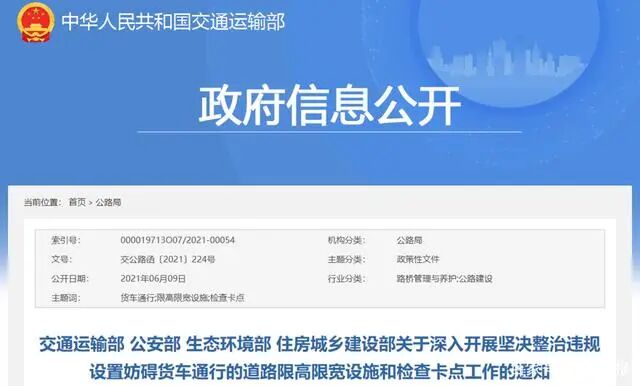 好消息来了!近日,由交通运输部、公安部、生态环境部、住建城乡建设部联合印发通知,通知中明确要求:6月16日起全面拆除取缔违规设置妨碍货车通行的道路限高限宽设施和检查卡点工作的通知!并将持续46天!