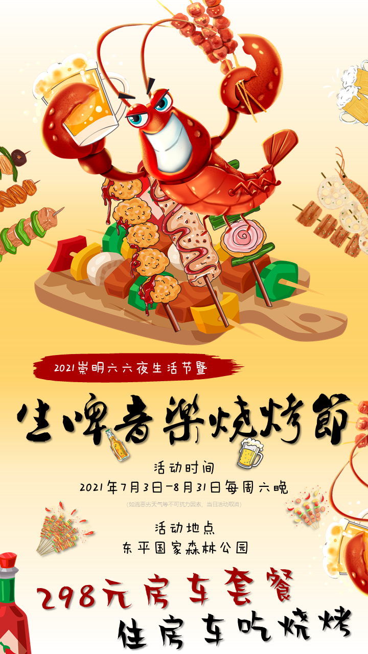 捉蝴蝶、数星星、听虫鸣、住房车……在烧烤露营区内烧烤食材、烤炉、炭火、啤酒已准备就绪,当炭火点燃,烤架上的肉串滋滋作响,幽幽飘香时,大家饮酒野餐,谈天论地,尽享快乐!