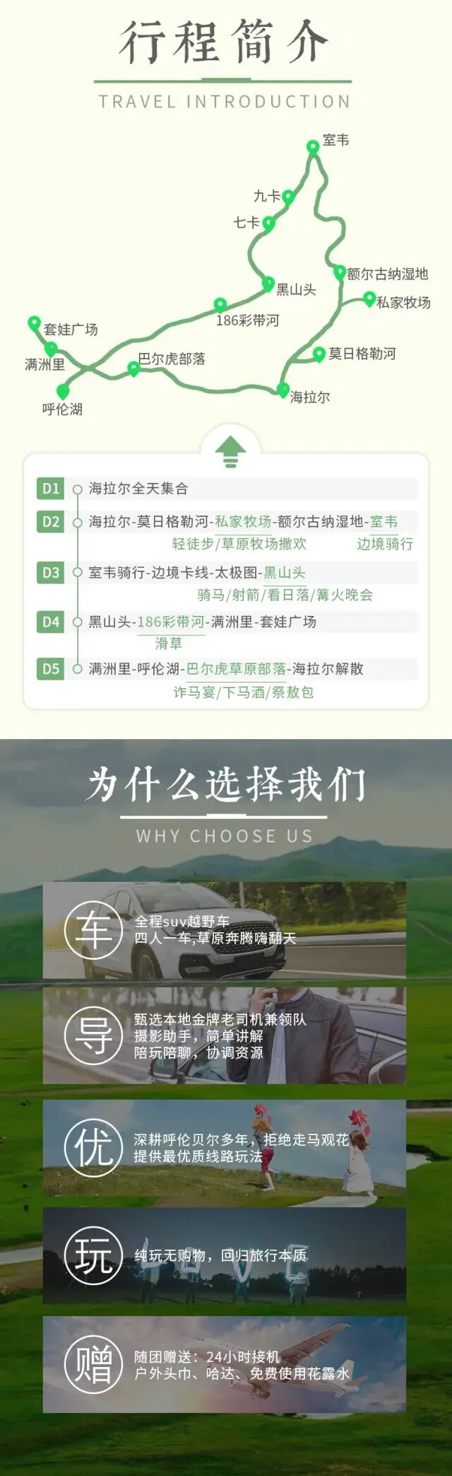 海拉尔-莫日格勒河(40KM,车程约0.5小时)-穿越草原腹地-草原私家牧场(150KM,车程约2.5小时)-额尔古纳湿地(50KM,车程约1小时)-室韦(160KM,车程约3小时)