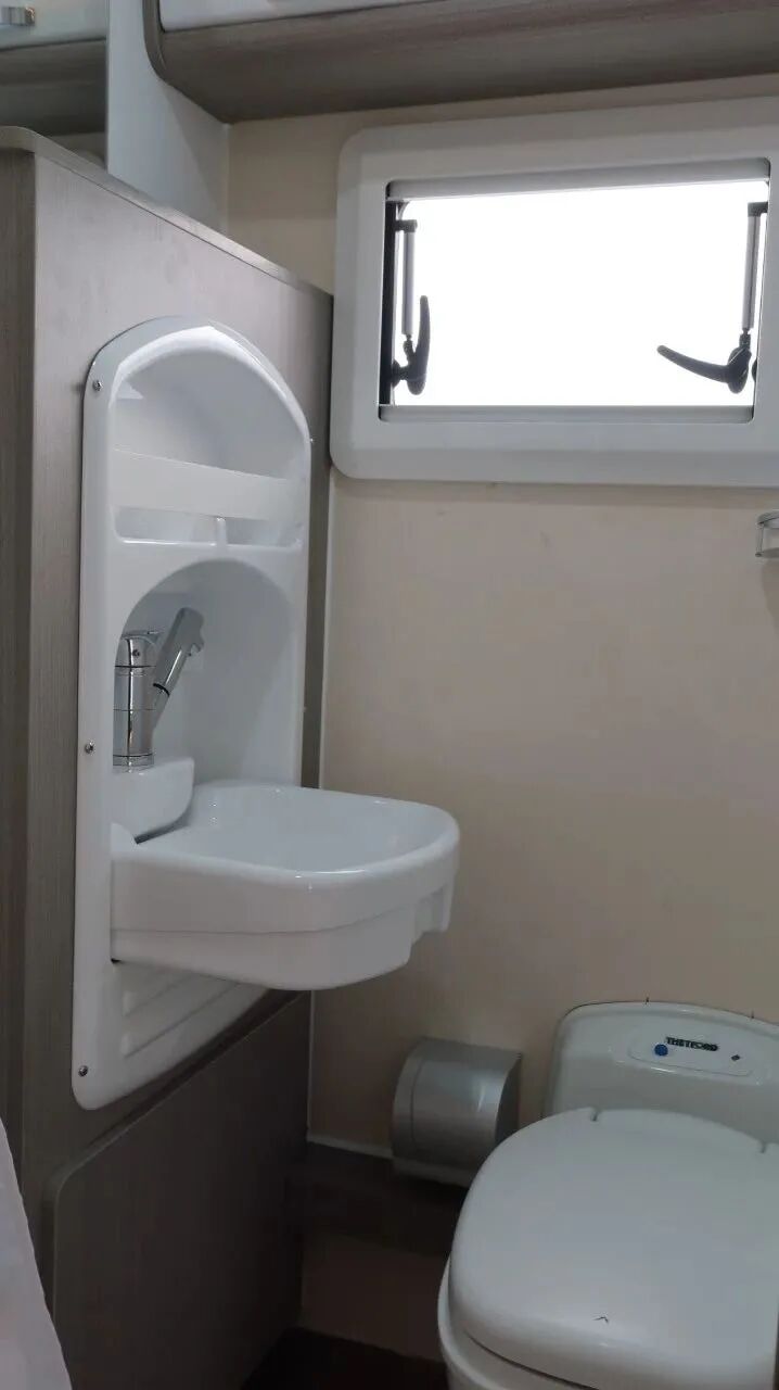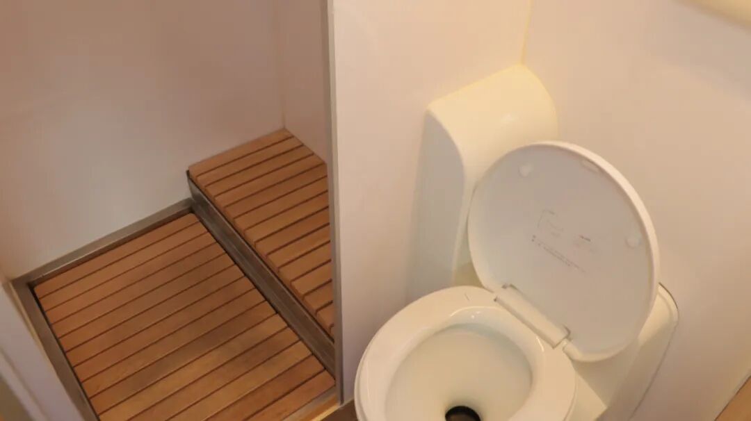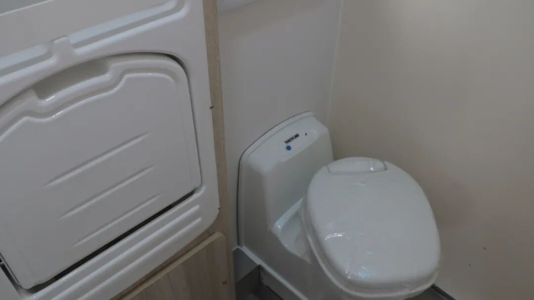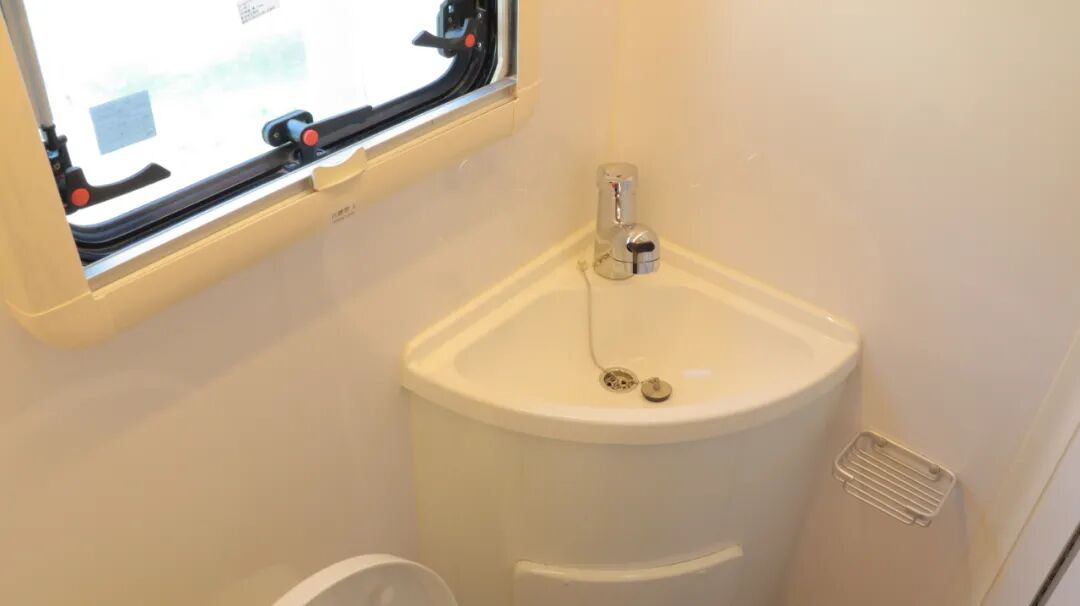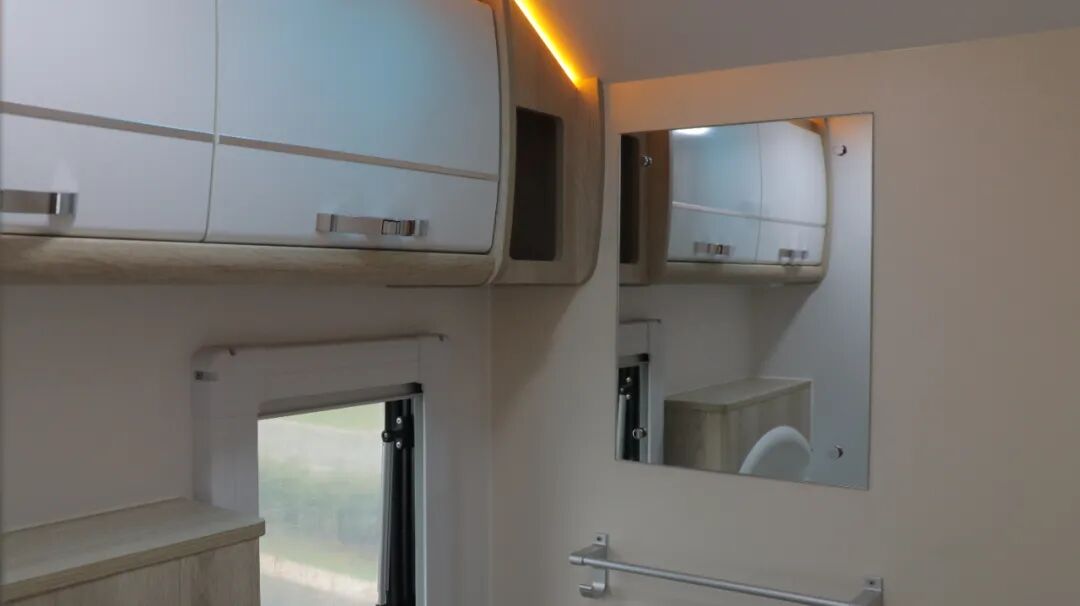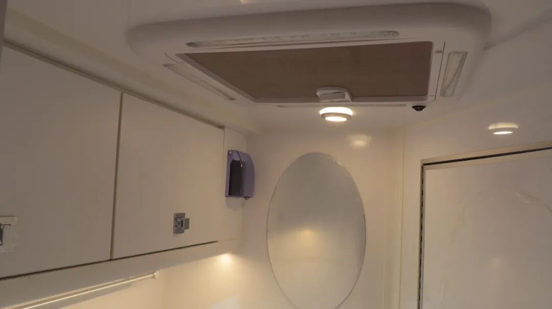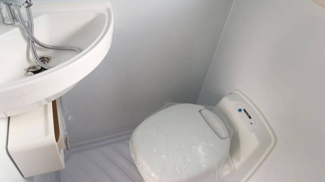 干湿分离卫生间,内置三乔房车盒式马桶、梳妆镜、吊柜、梳洗面盆等设施。